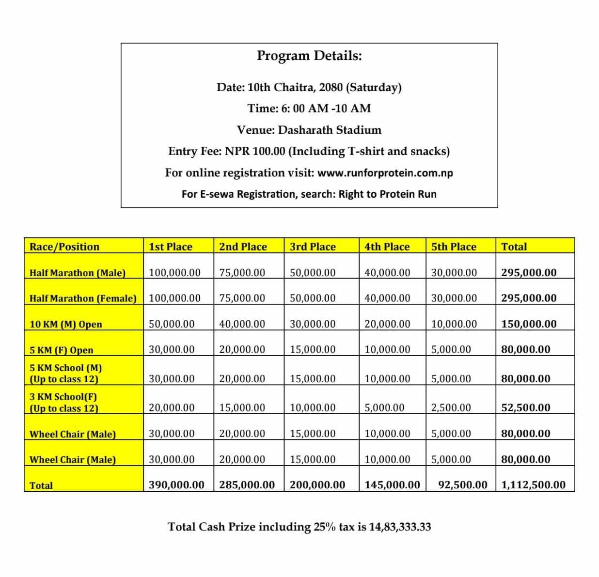 प्रतियोगितामा १४ लाख १२ हजार ५ सय रुपैयाँ पुरस्कार रहेको छ । हाफ म्याराथनको विजेताले १ लाख ३३ हजार ३ सय ३३ रुपैयाँ पाउनेछन्। त्यसमा पाँचौं स्थानसम्म प्राप्त गर्नेलाई नगद पुरस्कार रहेको बताइएको छ ।