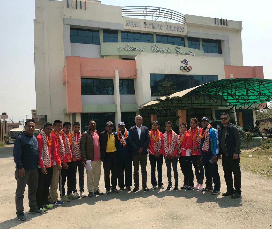त्यस्तै महिलामा विश्वरुपा बुढा, रेशु बस्नेत, सानुमाया कार्की र विन्द्रा श्रेष्ठ छन् । टोलीको प्रशिक्षकमा एथलेटिक्स मुख्य प्रशिक्षक अमिरीप्रसाद यादव र चन्द्रबहादुर गुरुङ छन् । टोलीलाई राष्ट्रिय खेलकुद परिषद्का उपाध्यक्ष एवं नेपाल ओलम्पिक कमिटीका महासचिव लामा टेन्डी शेर्पाले शनिबार बिदाई गरे ।