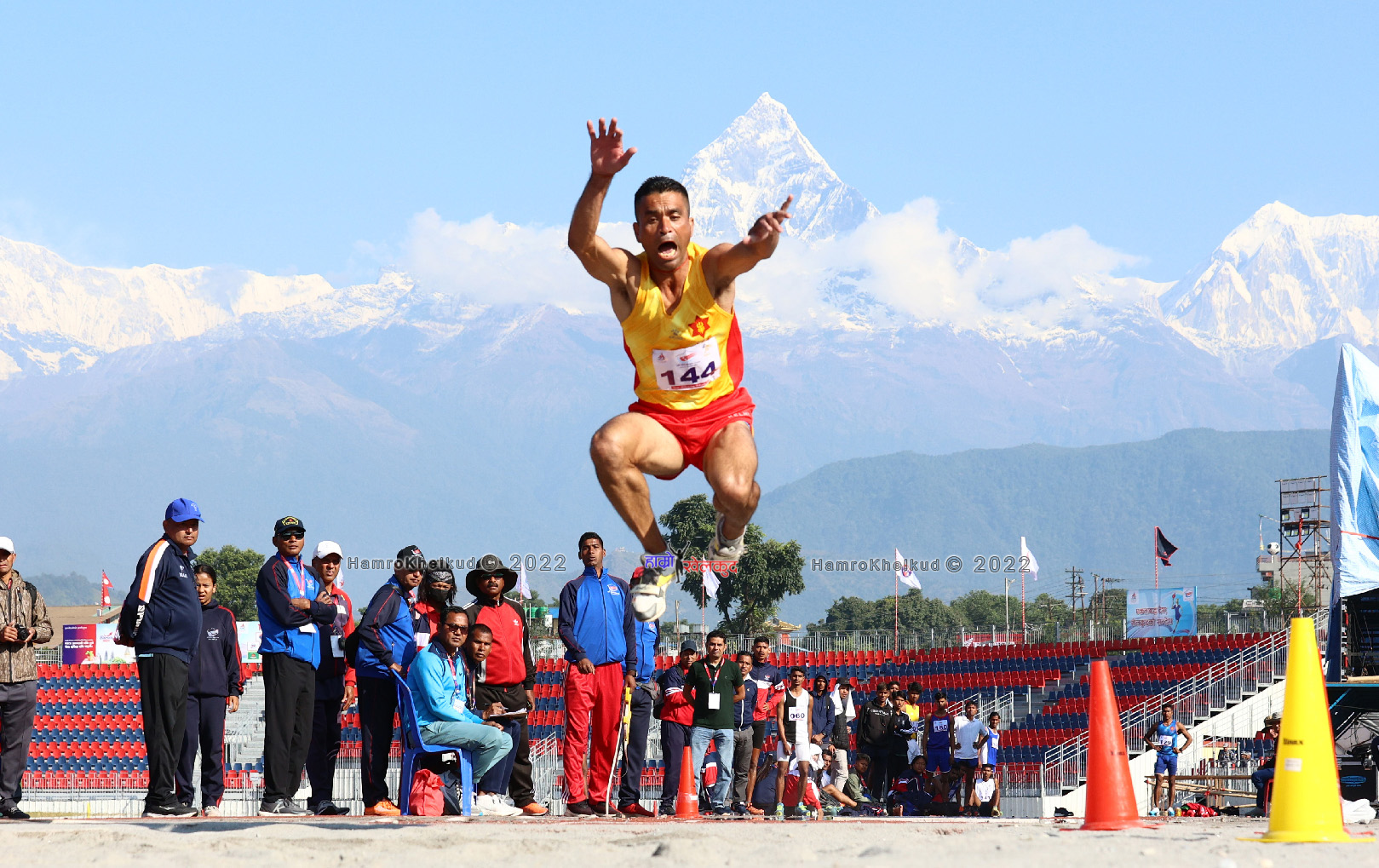एथलेटिक्सको पुरुष ट्रिपल जम्पमा आर्मीका डिल्ली खत्रीले स्वर्ण पदक जितेका छन् । डिल्लीले १३.९५ मिटर जम्प गर्दै स्वर्ण पदक जितेका हुन् । पुलिसका चन्द्रदेव जोशी १३.५५ मिटर जम्प गर्दै रजत जित्दा बागमती प्रदेशका सुदिप महतो १३.४४ मिटर जम्प गर्दै कास्य जित्न सफल भएका छन् ।