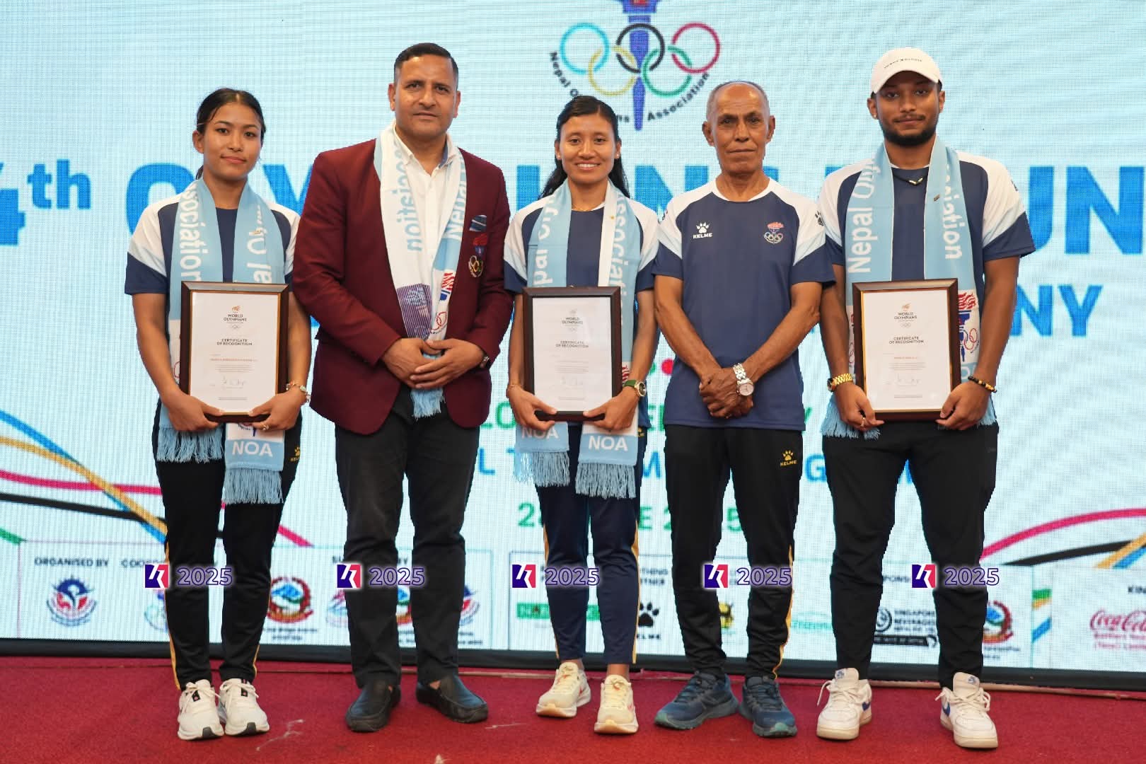 सोही अवसरमा अध्यक्ष विष्ट र कीर्तिमानी धावक बैकुण्ठ मानन्धरले पेरिस ओलम्पिकमा भाग लिएका ७ मध्ये ३ जना एथलेटिक्सका सन्तोषी श्रेष्ठ, जुडोकी मनिता श्रेष्ठ प्रधान र ब्याडमिन्टनका प्रिन्स दाहाललाई ओएलवाईको पिन र प्रमाण पत्र प्रदान गरे ।