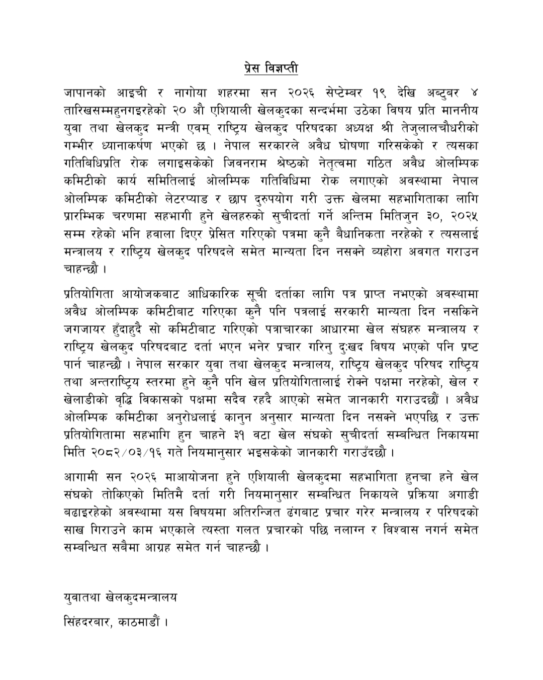 हिजो युवा तथा खेलकुद मन्त्रालयले ३१ खेल दर्ताको दाबी गर्दै प्रेस विज्ञप्ति जारी गरेको थियो। तर मन्त्रालयलाई हिजो मात्र इमेल-मार्फत ३१ खेलको सुची इमेल मार्फत पठाएको बताइएको छ ।
