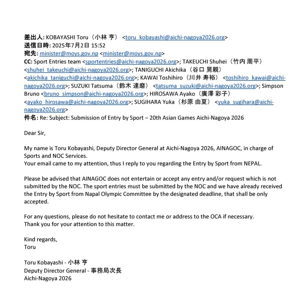 तर आयोजक कमिटीले नेपाल ओलम्पिक कमिटी (एनओसी) मार्फत खेल दर्ता गर्नुपर्ने नियम रहेको र सोही अनुरुप आउन जवाफ फर्काएको छ। सो जवाफमा एनओसीले पठाएको ३० खेल दर्ता भैसकेको पनि उल्लेख गरिएको छ।