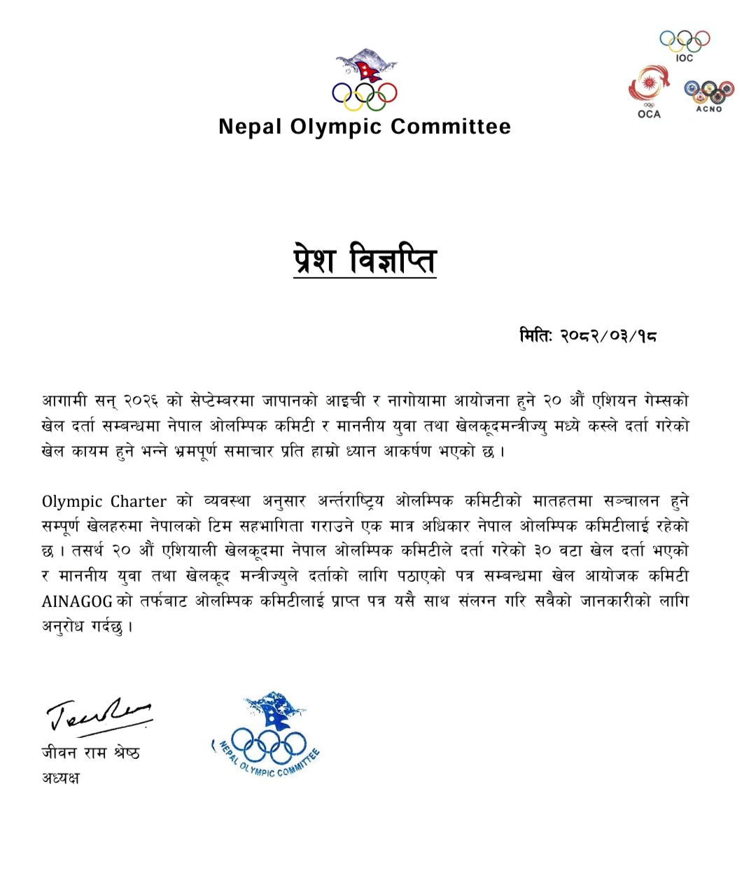 हिजो एनओसीले असार १६ गतेसम्म खेल दर्ता गर्नुपर्ने मिति रहेको कारण ३० खेलले जवाफ पठाएको र त्यहि खेल दर्ता भएको जनाएको थियो।