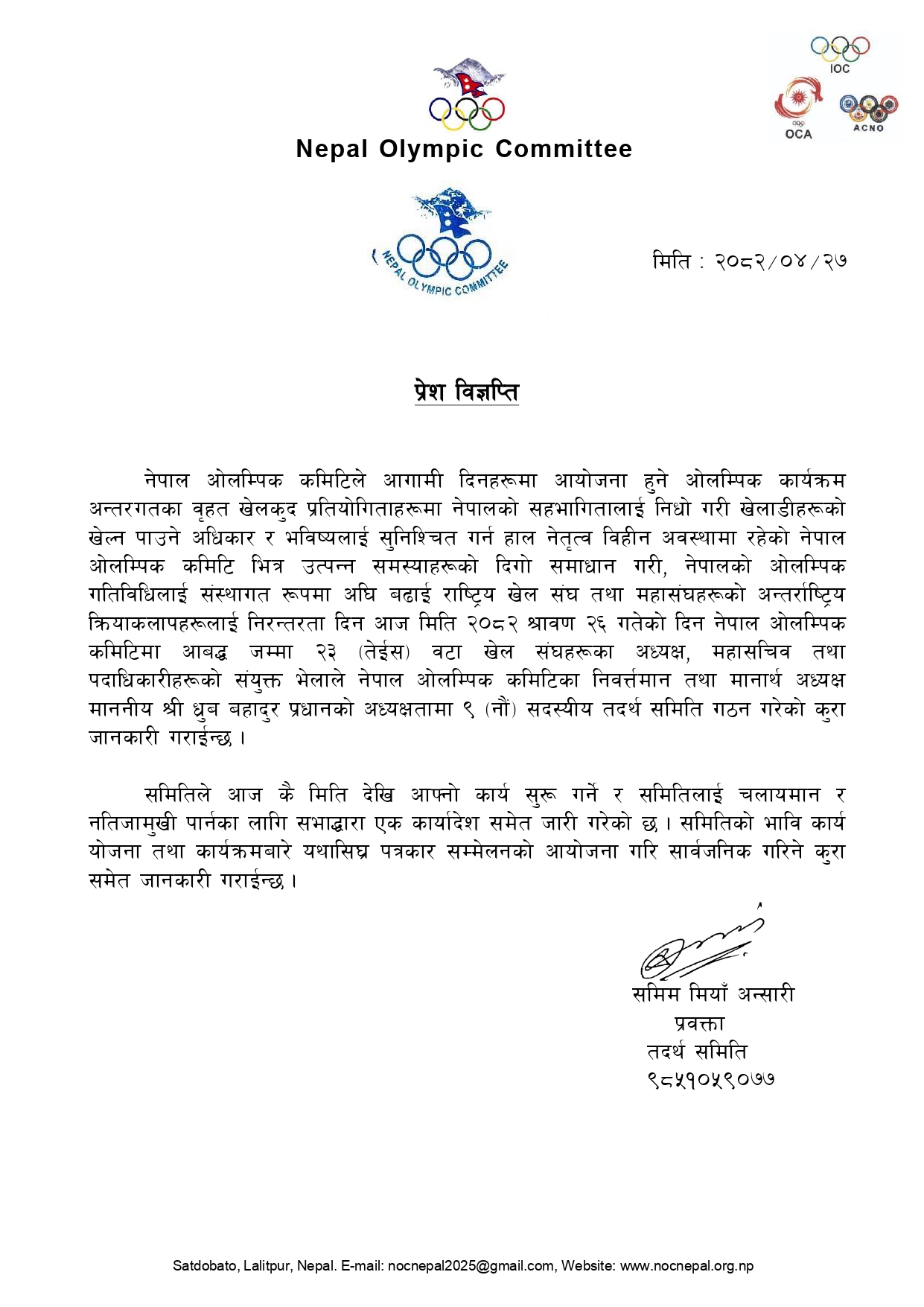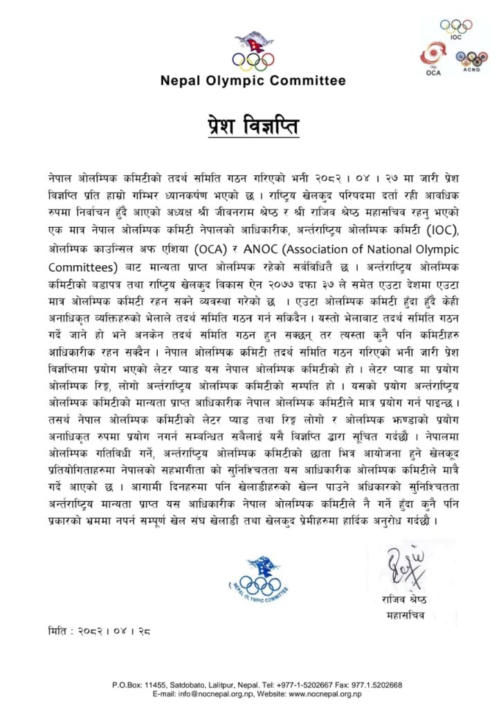 ‘ २०८२ साउन २६ गतेको दिन नेपाल ओलम्पिक कमिटिमा आबद्ध जम्मा २३ वटा खेल संघहरूका अध्यक्ष, महासचिव तथा पदाधिकारीहरूको संयुक्त भेलाले नेपाल ओलम्पिक कमिटिका निवर्त्तमान तथा मानार्थ अध्यक्ष माननीय श्री ध्रुब बहादुर प्रधानको अध्यक्षतामा ९ सदस्यीय तदर्थ समिति गठन गरेको कुरा जानकारी गराइन्छ,’ विज्ञप्ति भनिएको थियो।