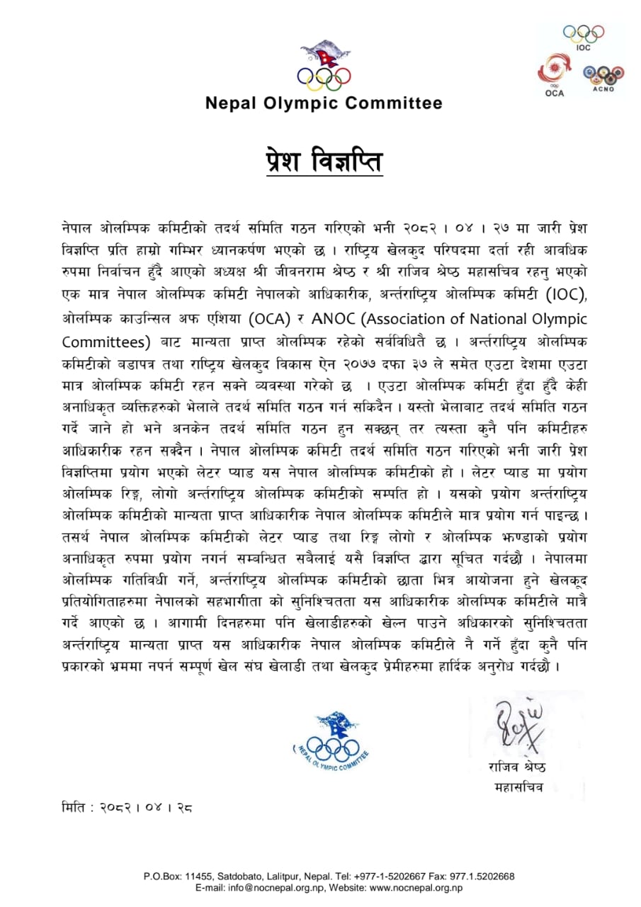 जीवनराम श्रेष्ठ नेतृत्वको अन्तर्राष्ट्रिय मान्यता प्राप्त एनओसीका महासचिव राजिव श्रेष्ठले बुधवार विज्ञप्ति जारी गर्दै राष्ट्रिय खेलकुद परिषद् (राखेप) मा दर्ता रही आवधिक निर्वाचन गर्दै आएको तथा अन्तर्राष्ट्रिय ओलम्पिक कमिटी (आइओसी) र ओलम्पिक काउन्सिल अफ एसिया (ओसिए) बाट मान्यता प्राप्त एनओसी आफूहरु मात्र भएको दाबी गरेका छन्।