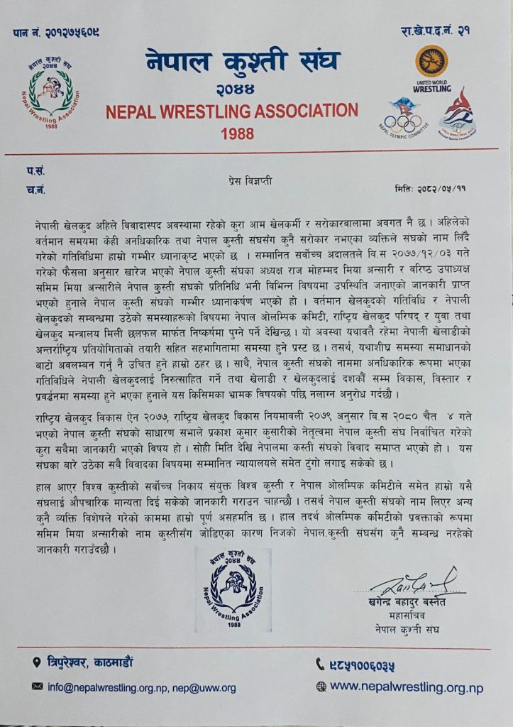 संघले भनेको छ, ‘नेपाल कुस्ती संघको नाममा हुने अनधिकृत गतिविधिले खेलाडीलाई निरुत्साहित गर्ने र खेलकुदको विकासमा दीर्घकालीन असर पार्ने भएकाले यस्ता भ्रामक गतिविधिमा नफस्न सबै सरोकारवालालाई अनुरोध गर्दछौं।’