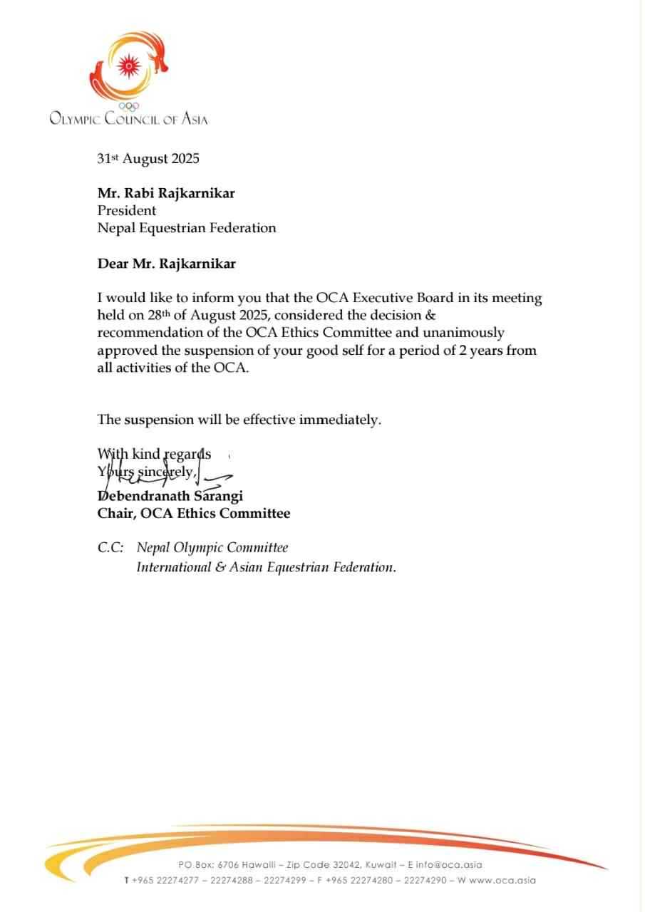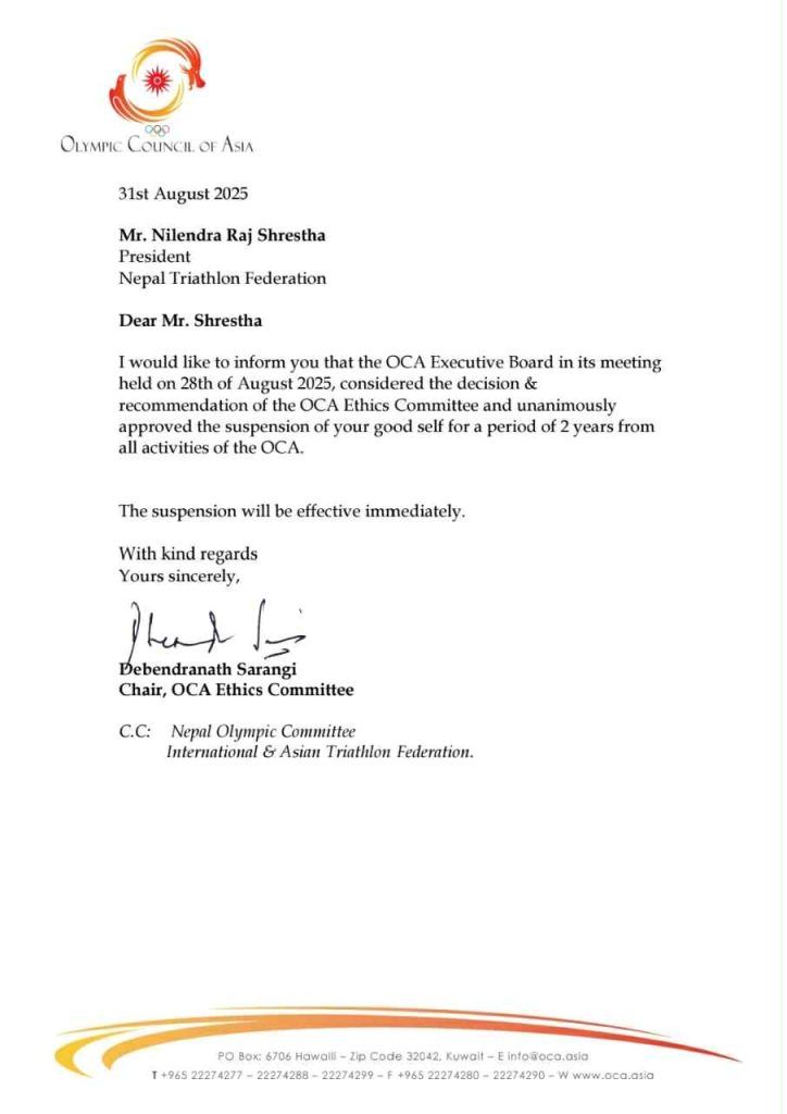 निलम्बन सम्बन्धि पत्रको प्रतिलिपि अन्तराष्ट्रिय मान्यता प्राप्त नेपाल ओलम्पिक कमिटी (एनओसी) , अन्तर्राष्ट्रिय तथा एसियाली घोडचडी महासंघ र अन्तर्राष्ट्रिय तथा एशियाली ट्रायथलन महासंघलाई पनि पठाइएको छ।