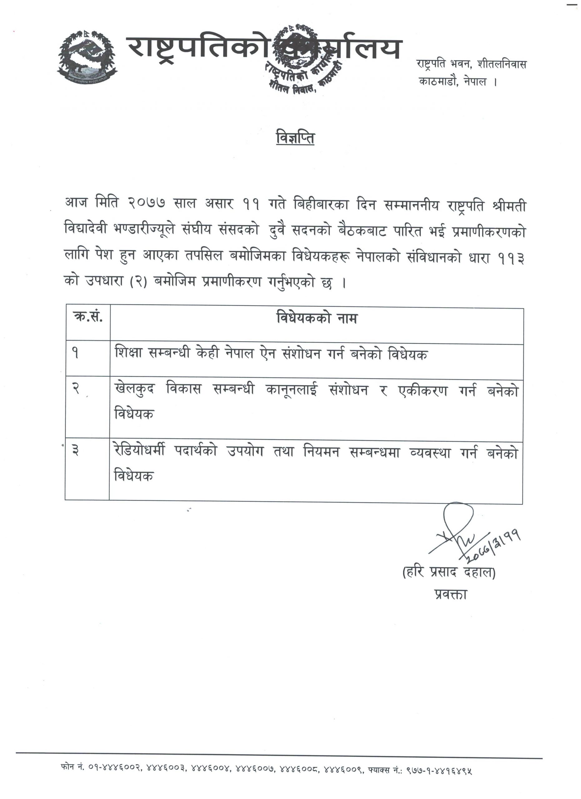 काठमाडौं (हाम्रो खेलकुद)– नेपालमा नयाँ खेलकुद विकास ऐन लागु हुने भएको छ । संघिय संसदको दुवै सदनको बैठकबाट पारित भइसकेको ऐनलाई राष्ट्रपति विद्यादेवी भण्डारीले बिहीबार प्रमाणीकरण गरेसँगै खेलकुदमा नयाँ ऐन लागु भएको हो ।