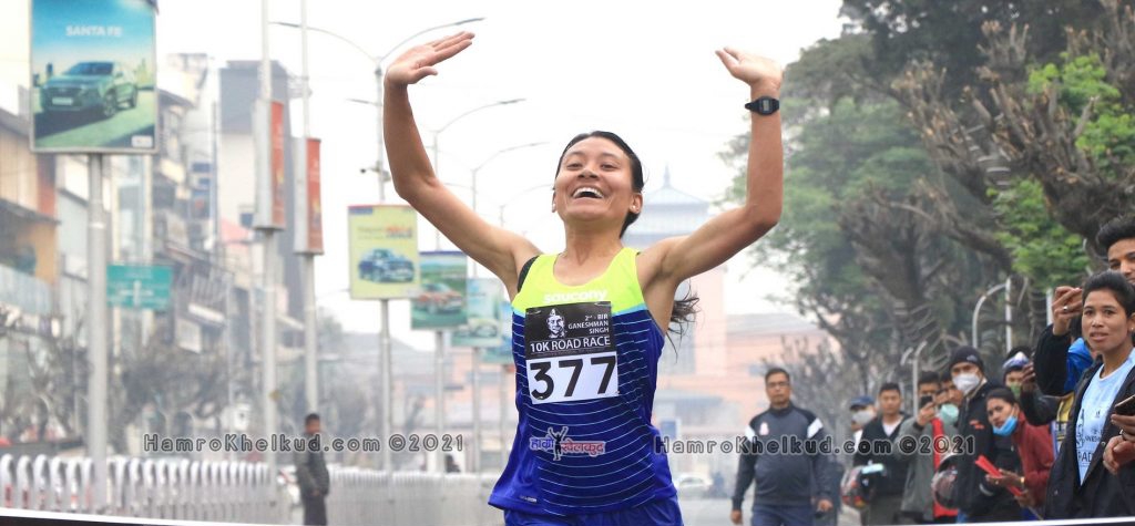 धरान (हाम्रो खेलकुद)- सन्तोषी श्रेष्ठले धरान १० के महिलातर्फको उपाधि जितेकी छन् ।