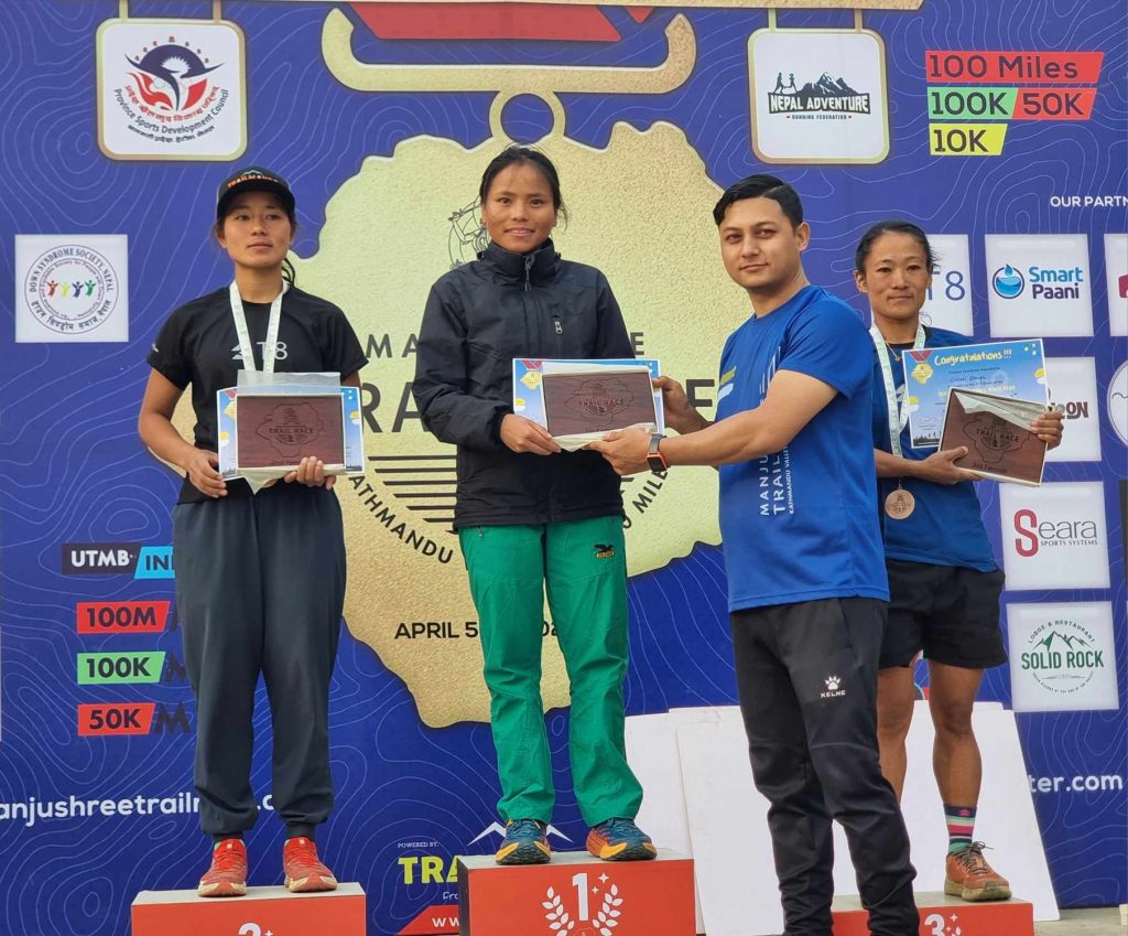 महिलातर्फ रसिला तामाङ (९ घण्टा १३ मिनेट ६ सेकेन्ड) दोस्रो र छोकी शेर्पा (९ घण्टा १६ मिनेट ४५ सेकेन्ड) तेस्रो भइन् ।