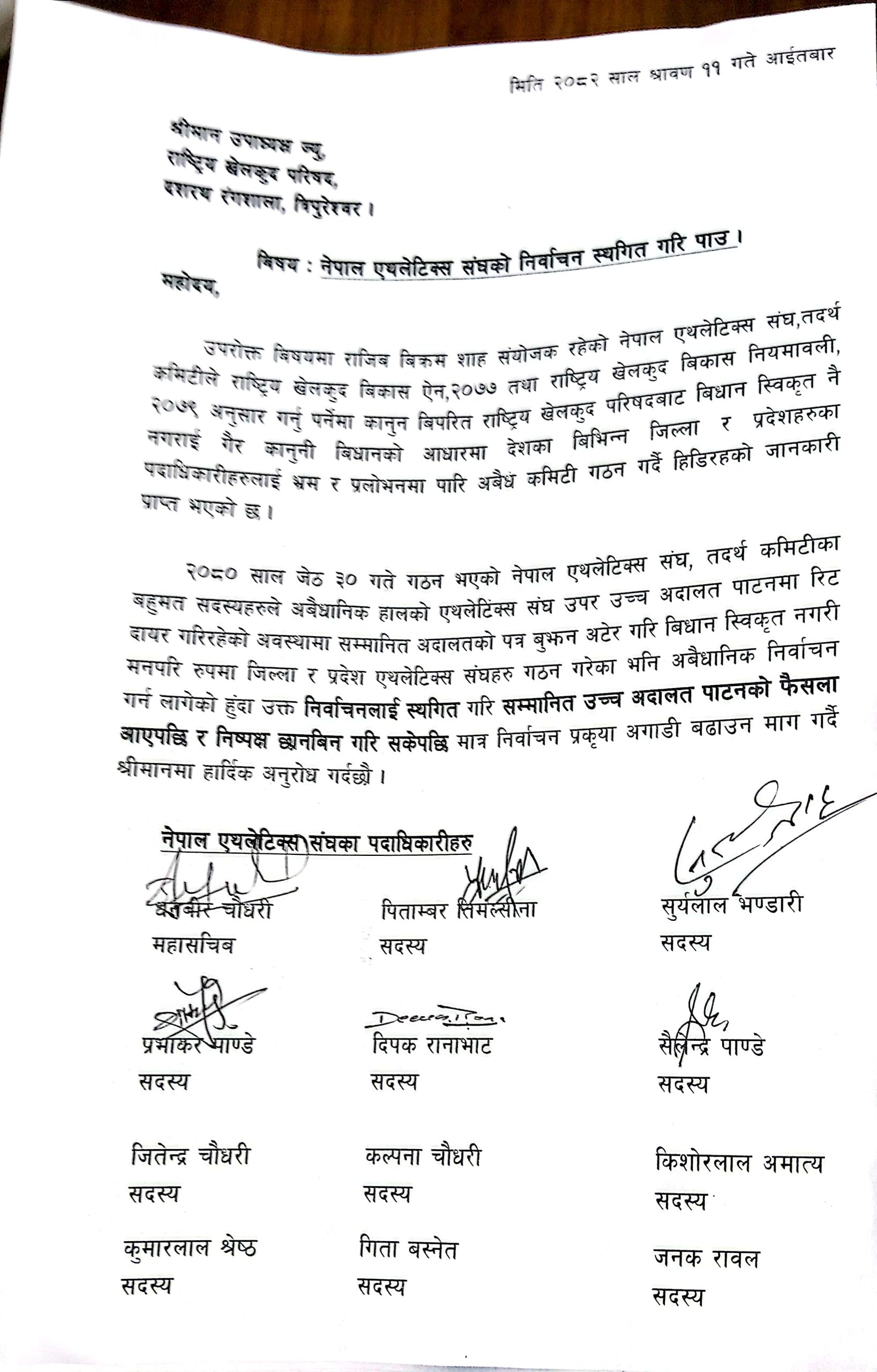 २०८० जेठ ३० गते गठन भएको नेपाल एथलेटिक्स संघ, तदर्थ कमिटीका बहुमत सदस्यहरुले अवैधानिक हालको एथलेटिक्स संघ उपर उच्च अदालत पाटनमा रिट दायर गरेको बताइएको छ।