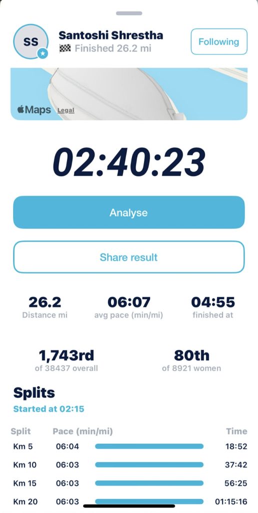 ४२.१९५ किलोमिटर म्याराथन सन्तोषीले २ घन्टा ४० मिनेट २३ सेकेन्डमा पूरा गर्दै कीर्तिमान बनाएकी हुन् । उनले लण्डन म्याराथन राखेको २ घन्टा ४२ मिनेट ५० सेकेन्डको आफ्नै कीर्तिमान तोडेकी हुन्।