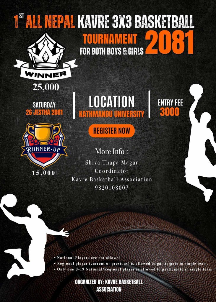 काठमाडौं विश्वविद्यालयको बास्केटबल कोर्टमा जेठ २६ गते हुने प्रतियोगिताको दुवैतर्फको विजेताले २५ हजार र दोस्रो टोलीले १५ हजार रुपैयाँ प्राप्त गर्नेछन् । सहभागिताका लागि टोलीले ३ हजार रुपैयाँ दर्ता शुल्क बुझाउनुपर्नेछ ।