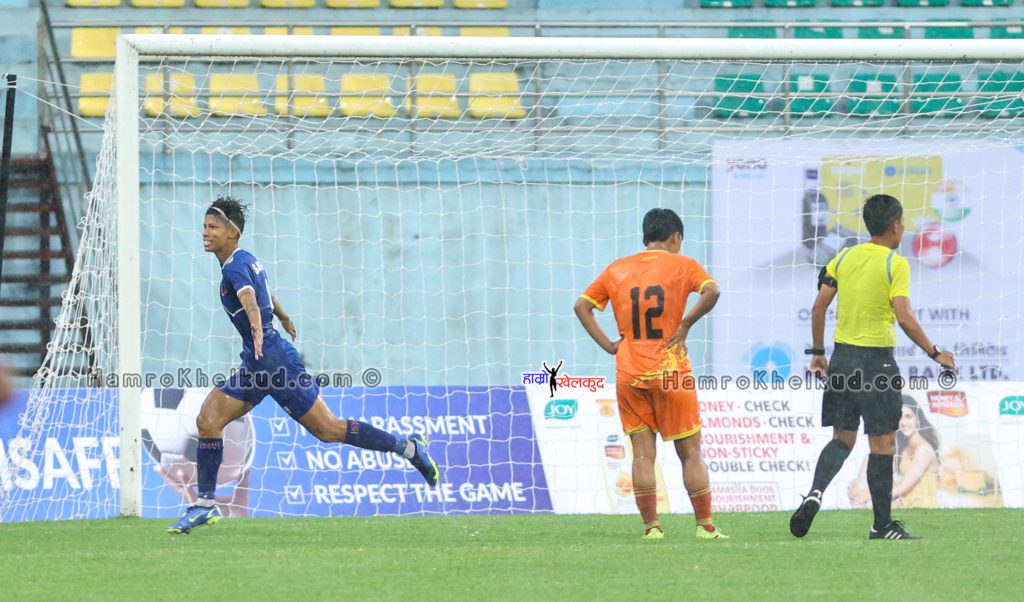 ११औं मिनेटमा हिरा कुमारी भुजेलको बक्स बाहिरको सशक्त प्रहार पोलमा लागेर फर्कदा नेपाल अग्रता लिनबाट चुक्यो । १२औं मिनेटमा सावित्राले गोल गर्दै नेपाललाई सुरुवाती अग्रता दिलाइन् । गोलरक्षक सविता मोन्गेर अघि बढ्दै बललाई क्लियर गर्न खोजेको अवस्थामा अमिशासँग जुध्दै आएको बललाई सावित्राले खाली पोस्टमा गोल गर्न सफल भइन् ।