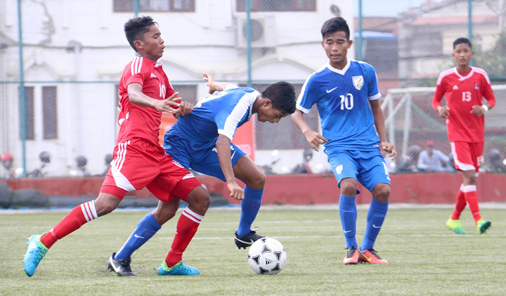 काठमाडौं(हाम्रो खेलकुद) – नेपाली युथ टोली साफ यू १५ च्याम्पियनसिपको उपाधिबाट वञ्चित बनेको छ । एन्फा कम्प्लेक्सको खेल मैदानमा आइतबार भएको खेलमा नेपाल सधैको जस्तै भारतसँग २–१ ले पराजित हुदै उपाधिबाट वञ्चित बनेको हो । तस्बिर : बिबेक सुबेदी / हाम्रो खेलकुद