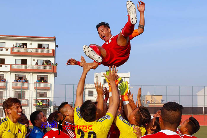 काठमाडौं (हाम्रो खेलकुद) – फिलिपिन्स विरुद्ध ८१ औं मिनेटमा मैदान प्रवेश गरेसँगै अनिलले राष्ट्रिय टोलीको लागि ५० खेल पुरा गरे । यो अनिलको राष्ट्रिय टोलीबाट अन्तिम खेल थियो । तस्बिर : विवेक सुवेदी / हाम्रो खेलकुद मैदान प्रवेश गरे लगतै विराज महर्जनले अनिललाई आर्म ब्याण्ड सुम्पिएका थिए । यो खेलसँगै अन्तर्राष्ट्रिय फुटबलबाट सन्यास लिएका अनिललाई राष्ट्रिय फुटबल टोलीको […]