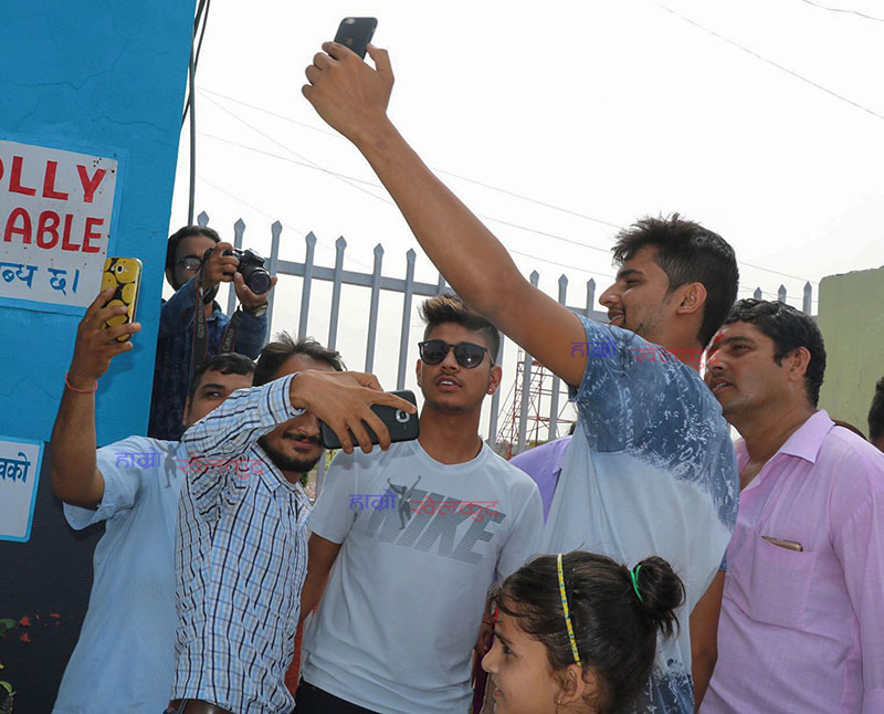 सन्दीपसँग सेल्फी : शुक्रबार दिउँसो गृहजिल्ला चितवन आएका सन्दीप लामिछानेसँग भरतपुर विमानस्थलमा सेल्फी खिच्दै फ्यानहरु । फोटोः विनोदबाबु रिजाल ।