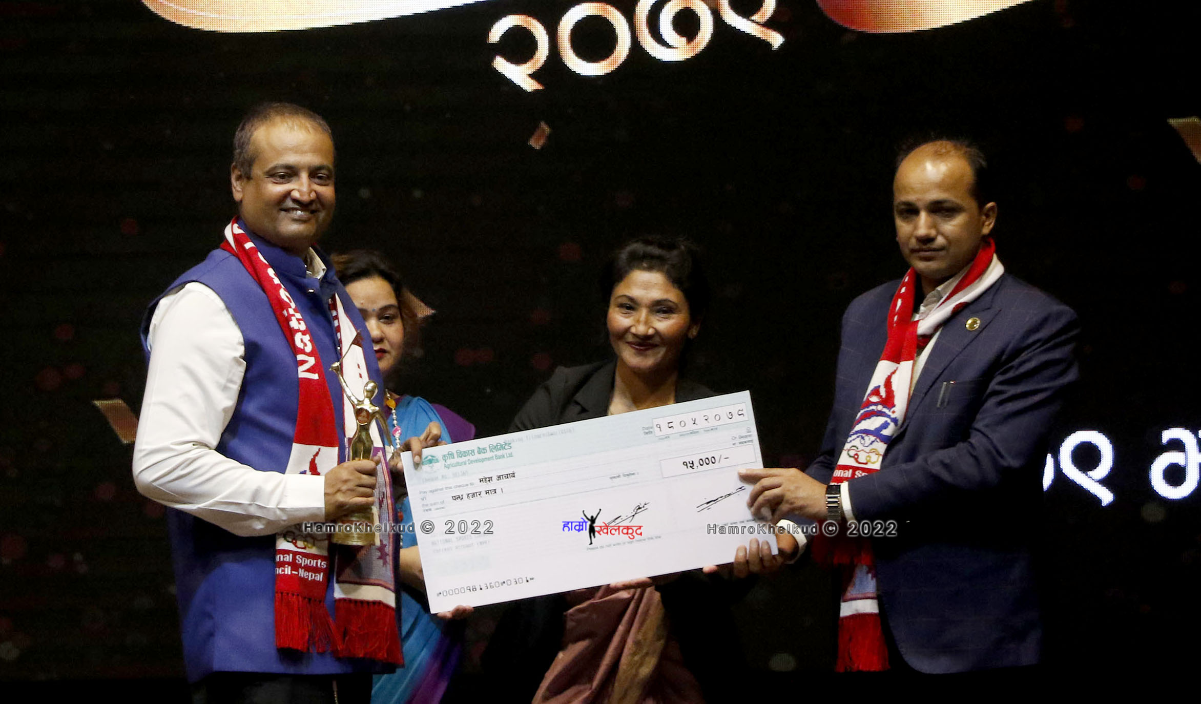 काठमाडौं (हाम्रो खेलकुद)– द हिमालयन टाइम्सका खेलकुद ब्यूरो प्रमुख महेश आचार्य र राष्ट्रिय समाचार समितिकी मुना कार्कीलाई राष्ट्रिय खेलकुद परिषद् (राखेप) ले उत्कृष्ट खेलकुद पत्रकार पुरस्कारबाट सम्मानित गरेको छ । राखेपको ५९ औं वार्षिकोत्सवको उपलक्ष्यमा शनिबार आयोजित कार्यक्रममा आचार्य र कार्की सम्मानित भएका हुन् । राखेप उपाध्यक्ष शिव कोइरालाले उनीहरुलाई ट्रफी र नगद हस्तान्तरण गरे […]