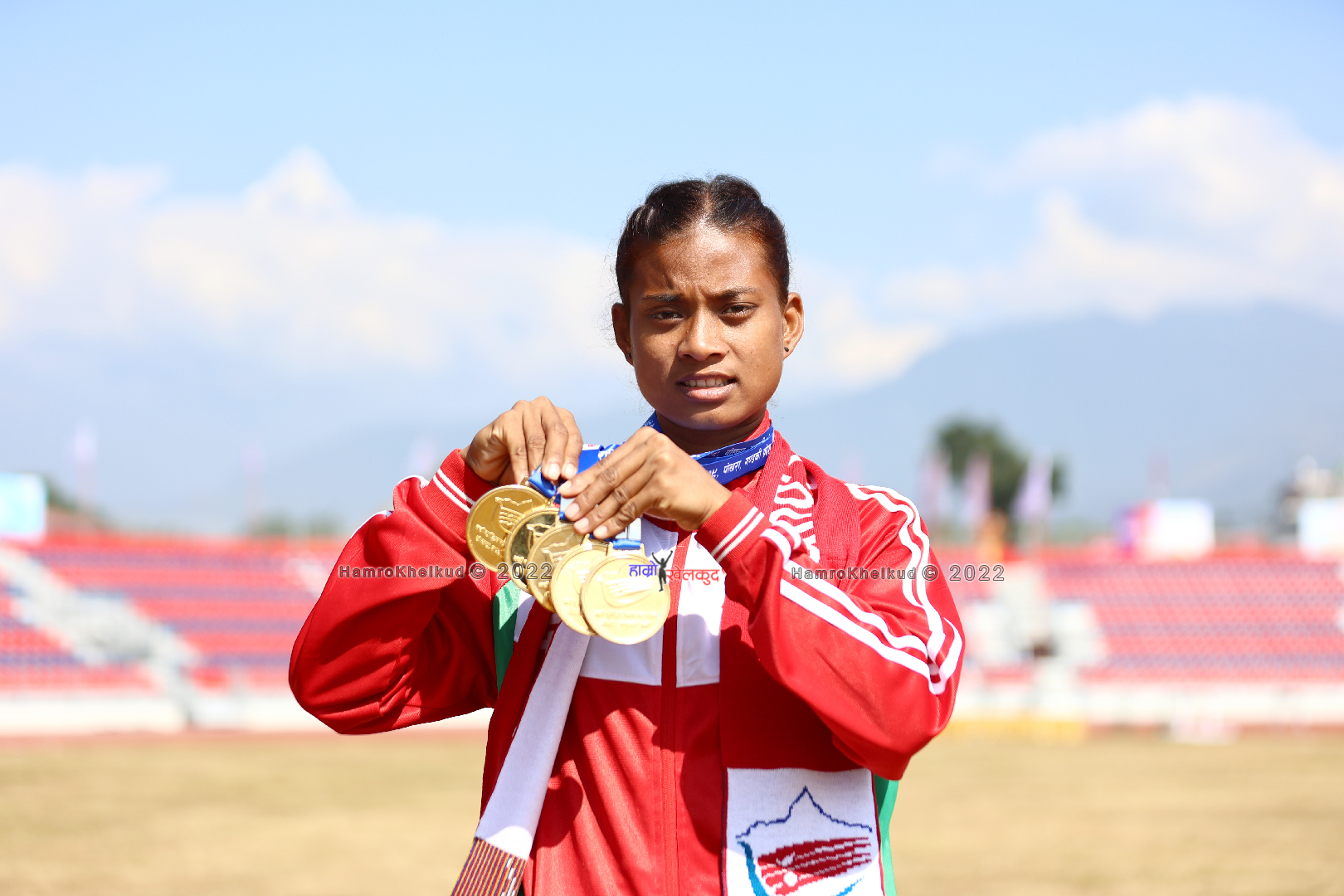 पोखरा (हाम्रो खेलकुद)– बागमतीकी सन्तोषी श्रेष्ठले नवौं राष्ट्रिय खेलकुदको ५ हजार मिटर दौडमा स्वर्ण पदक जितेकी छन् । नवौंमा यो उनको दोस्रो स्वर्ण पदक हो । पोखरा रंगशालाको ट्रयाकमा १७ मिनेट ०५.२९ सेकेन्डमा पूरा गर्दै पहिलो स्थान प्राप्त गरेकी छिन् । राष्ट्रिय कीर्तिमानको लक्ष्यका साथ दौड सुरु गरेपनि सोचे जस्तो हुन नसकेको सन्तोषले बताइन् । […]