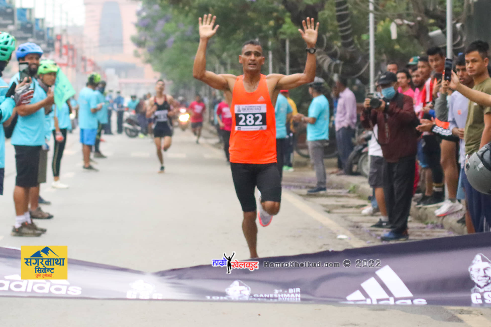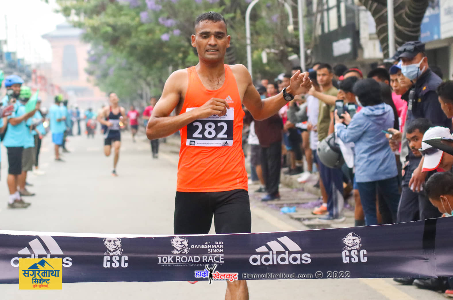 काठमाडौं (हाम्रो खेलकुद) – १३औं सागका स्वर्णधारी विभागीय नेपाल एपिएफ क्लबका धावक गोपीचन्द्र पार्कीले वीर गणेशमान सिंह स्मृति १० के रोड रेसमा ह्याट्रिक उपाधि जित्न सफल भएका छन् । गोपी पहिलोदेखि तेस्रो संस्करणसम्म लगातार च्याम्पियन बन्दै ह्याट्रिक उपाधि जित्न सफल भएका हुन् । शनिबार भएको तेस्रो संस्करणमा पनि गोपीले दोस्रो भएका आर्मीका दीपक अधिकारीलाई चार […]