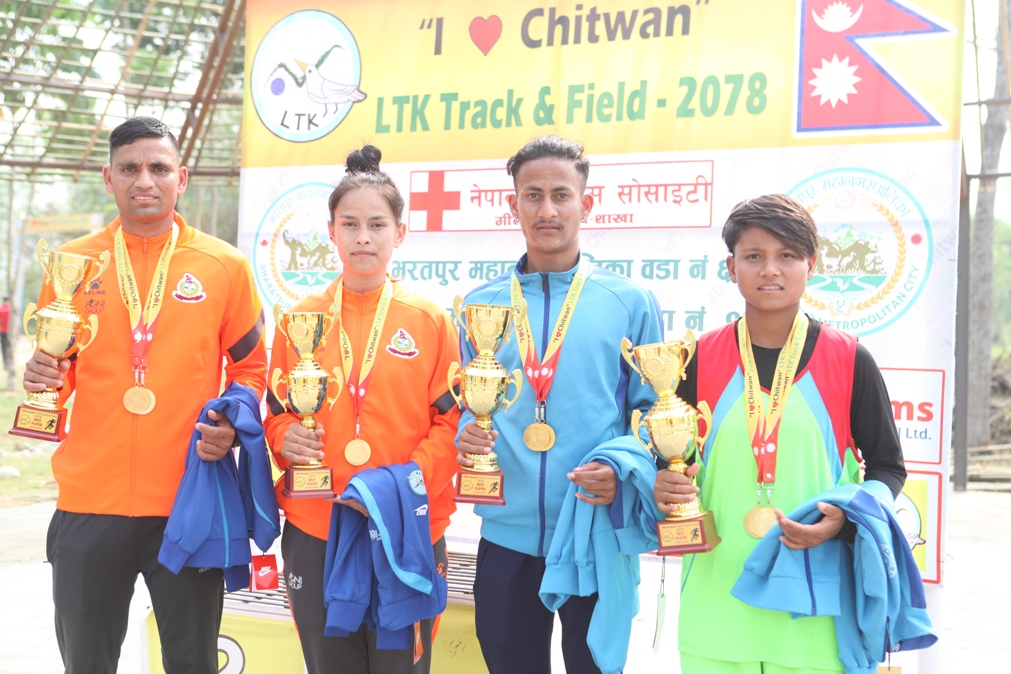 काठमाडौं (हाम्रो खेलकुद) – नेपाल एपीएफ क्लबका युवराज विक र भक्तपुरकी स्वागता खाइजु ‘आइ लभ चितवन’ एलटीके ट्रयाक एन्ड फिल्डको जुनियर ६० मिटर दौडमा पहिलो भएका छन् । पुरुषमा युवराजले ७.१ सेकेन्ड तथा महिलामा स्वागताले ८.६ सेकेन्डमा निर्धारित दूरी पूरा गरे । सिनियरतर्फ ४ सय मिटर दौडको पुरुषमा एपीएफका शिवराज पार्की तथा महिलामा एपीएफकै रमिताकुमारी […]