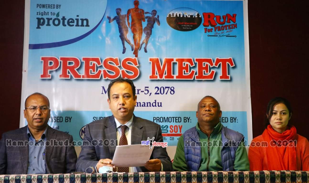 काठमाडौं (हाम्रो खेलकुद) – नेपाल भेटनरी एसोसिएनको आयोजनामा अर्को महिना काठमाडौंमा रन फर प्रोटिन हाफ म्याराथन आयोजन हुने भएको छ । आयोजकले आइतबार राजधानीमा पत्रकार सम्मेलनको आयोजना गर्दै म्याराथन पुस ३ गते शनिबार त्रिपुरेश्वरस्थित दशरथ रंगशालामा हुने जानकारी गराएको हो । प्रतियोगितामा खुल्ला हाफ म्याराथान (महिला÷पुरुष), खुल्लापुरुष १० किमि, महिला ५ किमि, १२ कक्षासम्मका विद्यार्थीलाई […]