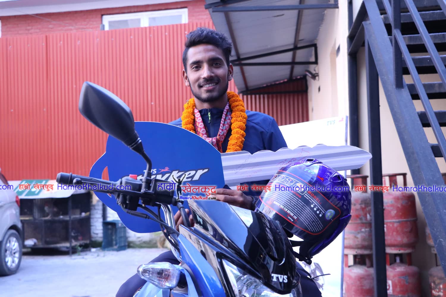 काठमाडौं (हाम्रो खेलकुद) – नेपाली एथलेटिक्समा ४५ वर्षपछि ऐतिहासिक स्वर्णपदक दिलाएका युवा खेलाडी अजित कुमार यादवलाई नेपाल एथलेटिक्स संघले शुक्रबार पुर्वघोषित पुरस्कारले सम्मानित गरेको छ । संघले राजधानीमा एक कार्यक्रममा बीच स्वर्ण धारी अजितललाई टिभीएस मोटरसाइकल प्रदान गरेको हो । यस्तै उनका प्रशिक्षक धनीराम चौधरीलाई पनि संघले १ लाख रुपैयाँसहित सम्मानित गरेको छ । संघले […]