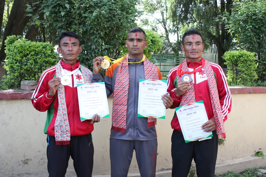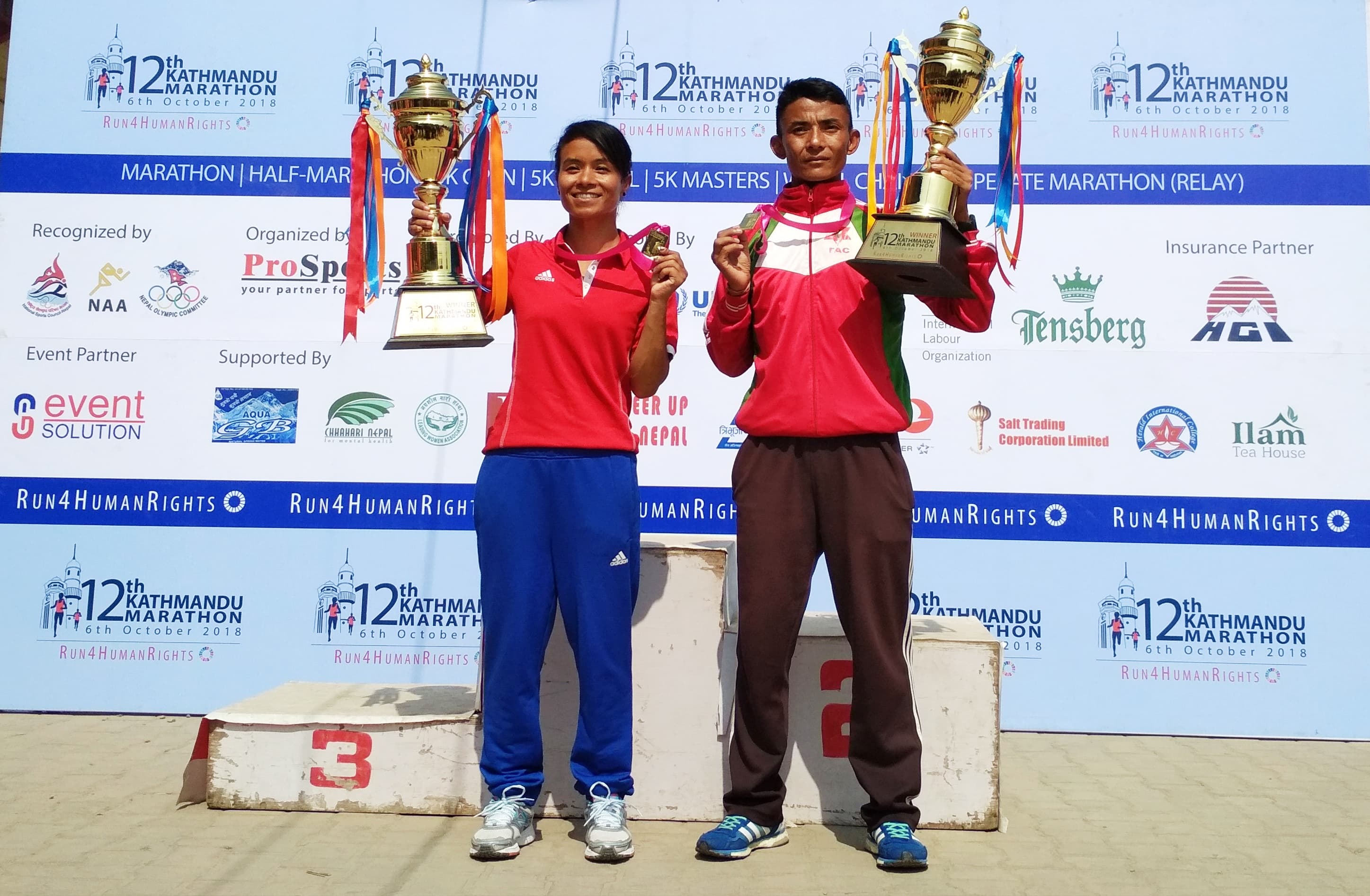 काठमाडौं (हाम्रो खेलकुद) – त्रिभुवन आर्मी क्लबका होमलाल श्रेष्ठ र नेपाली एपिएफ क्लबकी कान्छी माया कोँजु १२औं संस्करणको काठमाडौं म्याराथनको च्याम्पियन बनेकी छन् । त्रिपुरेश्वरस्थित दशरथ रंगशालामा शनिबार बिहान भएको म्याराथनमा पुरुषतर्फ होमलालले आफ्नै क्लबका राजन खत्रीलाई पछि पार्दै उपाधि जितेका हुन् । होमलालले निर्धारित दुरी २ घन्टा २० मिनेट ४५ सेकेन्डमा पुरा […]