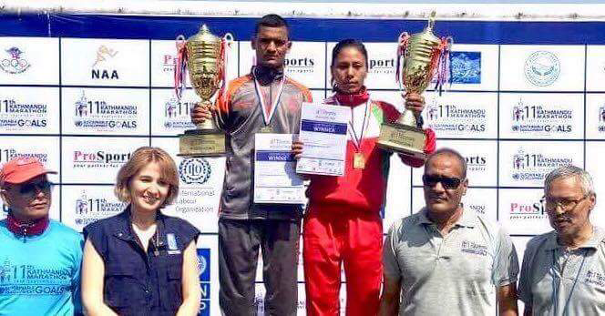 काठमाडौं (हाम्रो खेलकुद) – नेपाल एपिएफ क्लबका धावक गोपीचन्द्र पार्की र त्रिभुवन आर्मी क्लबकी सरिता बसीले ११ औं संस्करणको काठमाडौं म्याराथनको उपाधि जितेका छन् । काठमाडौंमा शनिबार भएको म्याराथनमा गोपीले त्रिभुवन आर्मी क्लबका होमलाल श्रेष्ठलाई ०.४ सेकेण्डले पछि पादै उपाधि जितेका हुन् । निर्धारित ४२.१९५ किलोमिटर गोपीले दुरी २ घण्टा २३.५६ सेकेण्डमा पूरा गरे । […]