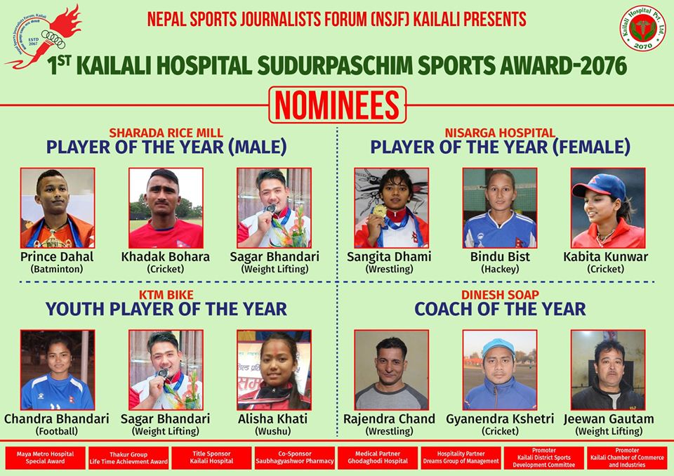 धनगढी (हाम्रो खेलकुद)– अर्को साता आयोजना हुने प्रथम कैलाली हस्पिटक सुदूरपश्चिम स्पोर्टस अवार्डको चार विधाको मनोनयन सार्वजनिक भएको छ । नेपाल खेलकुद पत्रकार मञ्च कैलाली समन्वय शाखाले बिहीबार पत्रकार सम्मेलन गर्दै पुस १५ गते आयोजना हुने अवार्डमा राखिएका ६ मध्ये लाइभ टाइम एचिभमेन्ट अवार्ड र स्पेशल अवार्डबाहेकको ४ विधाको मनोनाय सार्वजनिक गरेको हो । ४ […]