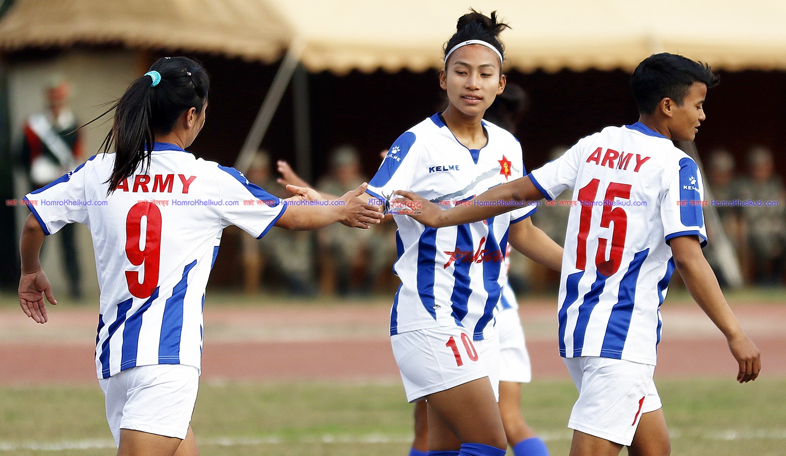 काठमाडौं (हाम्रो खेलकुद) – दुवै फरवार्डले ह्याट्रिक गरेपछि त्रिभुवन आर्मी क्लबले सातौं प्रधानसेनापति महिला फुटबल प्रतियोगिताको उद्घाटन खेलमा प्रदेश नं १ माथि ९-० को फराकिलो जित दर्ता गरेको छ । आर्मीको जितमा रश्मीकुमारी घिसिङ र शर्मिला थापामगरले ह्याट्रिक गर्नुका साथै विमला चौधरीले २ तथा सपना लामाले १ गोल गरिन् । पहिलो हाफमा ५-० को अग्रता […]