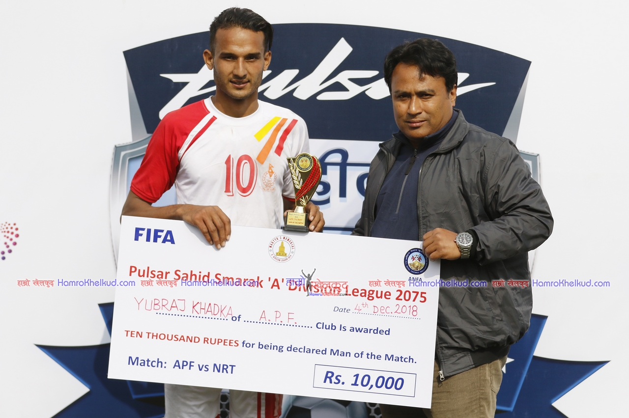काठमाडौं (हाम्रो खेलकुद) – पल्सर सहिद स्मारक ए डिभिजन लिग अन्तर्गत मंगलबारको पहिलो खेलमा नेपाल एपीएफ क्लबले न्यू रोड टिम (एनआरटी) लाई २-१ ले पराजित गरेको छ । एपीएफको जितमा म्यान अफ द म्याच युवराज खड्का र सुदिप सिख्राकारले १-१ गोल गरे । एपीएफले खेलको तेस्रो मिनेटमा नै अग्रता लिएको थियो । दायाँ विङबाट श्याम […]