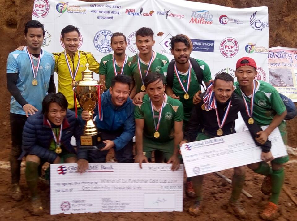 दिपक बोहोरा फिदिम – विर्ता युनाइटेड झापाले शनिबार प्रथम पाँचथर गोल्ड कपको उपाधि जितेको छ । एपिएफ पूर्वाञ्चललाई टाइब्रेकरमा ४–२ ले हराउँदै विर्ता च्याम्पियन बनेको हो । यसअघि पुसमा फिदिममा नै भएको आठौं फाल्गुनन्द गोल्ड कपको उपाधि पनि विर्ताले नै जितेको थियो । उपाधिसहित विर्ताले १ लाख ५० हजार रुपैयाँ प्राप्त गर्यो । एपिएफले १ […]