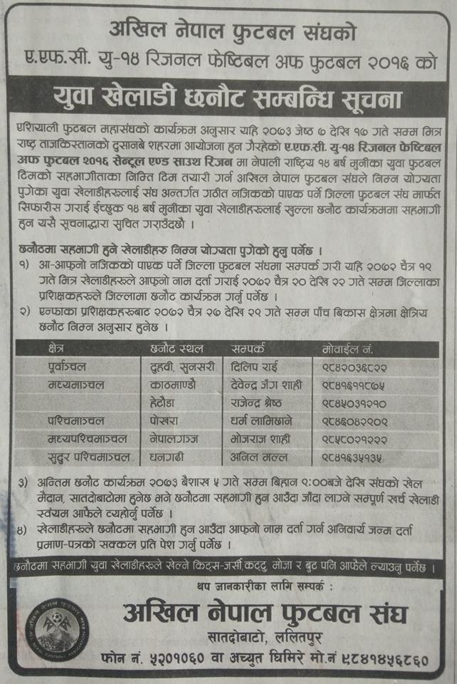 अखिल नेपाल फुटबल संघले (एन्फा) मे महिनामा हुने ए.एफ.सी. यु-१४ प्रतियोगिताको लागि चौध वर्ष मुनिका खेलाडीहरुको खुला छनोटको कार्यक्रम तय गरेको छ | जिल्ला छनोट र क्षेत्रीय छनोट पार गर्दै केन्द्रीय छनोट पार गर्ने खेलाडीहरुले नेपालको प्रतिनिधित्व गर्दै ताजिकिस्तानमा ए.एफ.सी. अन्डर १४ प्रतियोगिता खेल्ने छन् | यससंगै टि खेलाडीहरु एन्फा एकेडेमीमा रही प्रशिक्षण पनि गर्नेछन् […]