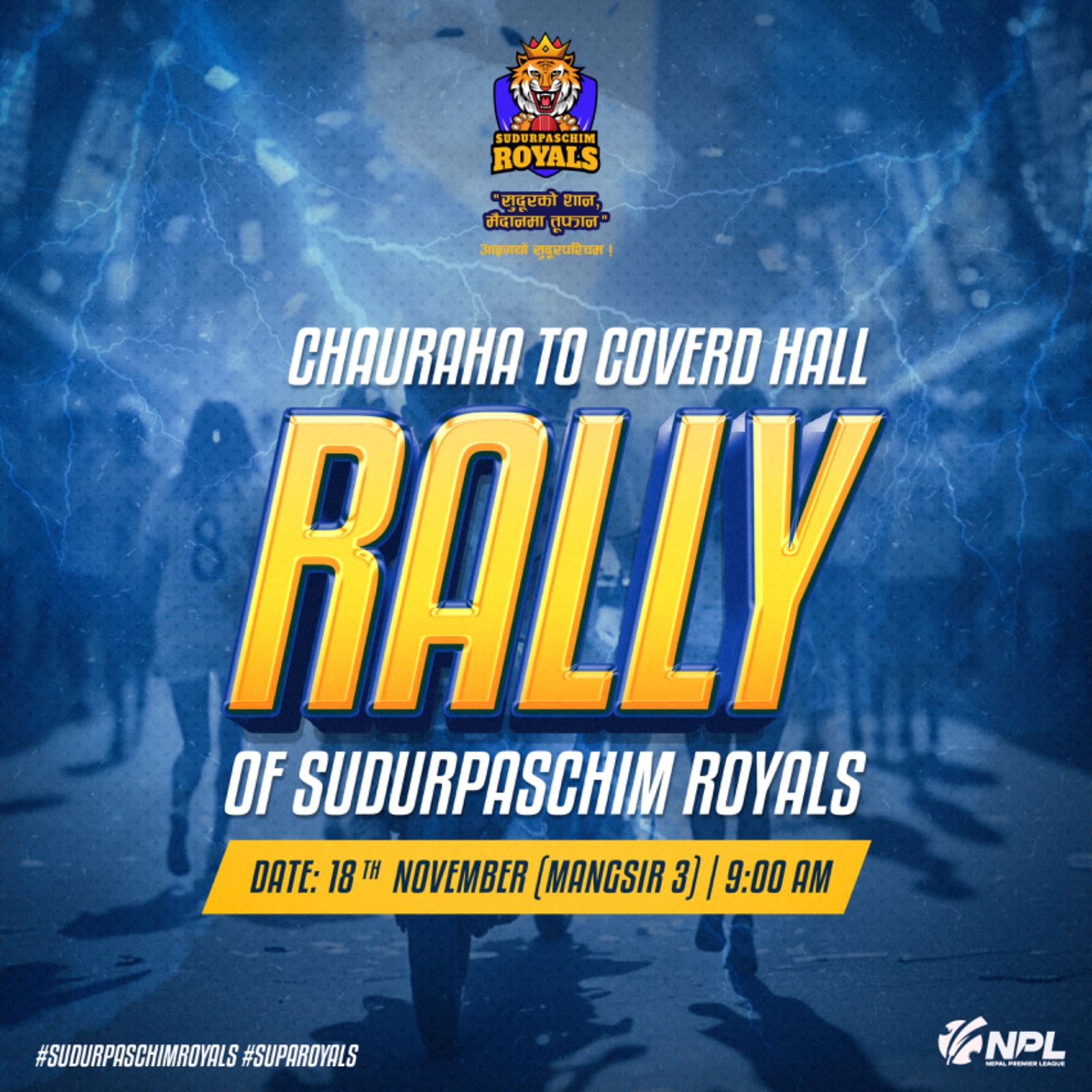 काठमाडौं(हाम्रो खेलकुद) – सिद्धार्थ बैंक नेपाल प्रिमियर लिग(एनपिएल) टोली सुदूरपश्चिम रोयल्सले सोमवार धनगढीमा र्याली आयोजना गर्ने भएको छ । सुदूरपश्चिमले धनगढीको चौराहदेखि रंगशालासम्म र्यालीको आयोजना गर्ने भएको हो । र्यालीमा टोलीका मार्की खेलाडी दिपेन्द्र सिंह ऐरी तथा खेलाडीहरु आरिफ शेख, विनोद भण्डारी लगायत टिममा आवद्ध भएका उपलब्ध हुने सबै खेलाडीको सहभागिता रहनेछ । र्यालीको तयारी […]