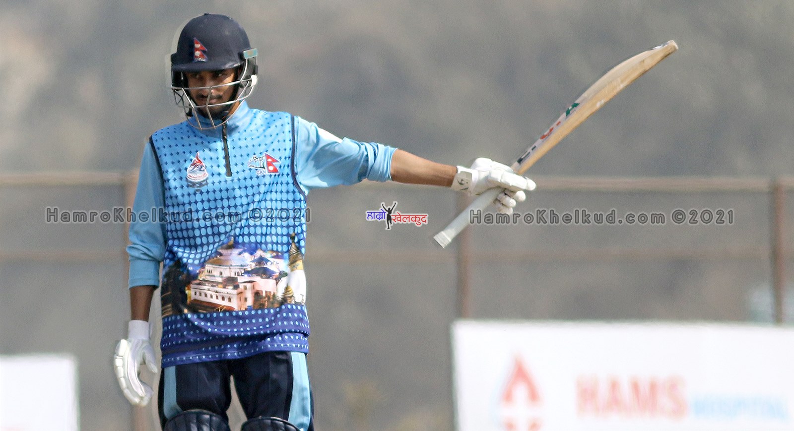 काठमाडौं (हाम्रो खेलकुद) – कर्णालीका युवा बाँया हाते ब्याट्सम्यान हेमन्त ओलीले चौथो संस्करणको प्रधानमन्त्री कप एकदिवसिय क्रिकेट प्रतियोगितामा नेपाल एपिएफ क्लबविरुद्ध अर्धशतक प्रहार गरेका छन् । हेमन्तले ८८ बलमा अर्धशतक पूरा गरेका हुन् । तीव्र गतिका बलर कमलसिंह ऐरीलाई चौका प्रहार गर्दै हेमन्तले अर्धशतक प्रहार गरेका थिए । २ सय १९ रनको विजयी लक्ष्य पछ्याएको […]
