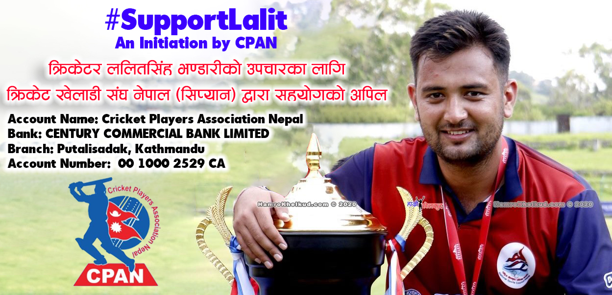 काठमाडौं (हाम्रो खेलकुद) – मोटरसाईकल दुर्घटनामा परि गम्भीर घाइते भएका तीव्र गतिका बायाँ हाते बलर ललितसिंह भण्डारीको उपचारमा नेपाल क्रिकेट संघ (क्यानले) आर्थिक सहयोग गर्ने भएको छ । नेपाल क्रिकेट संघ (क्यान) का अध्यक्ष चतुर बहादुर चन्दले आफूहरुले सक्दो सहयोग गर्ने बताएका हुन् । ‘हामीले सक्दो सहयोग छौं । खेलाडीको उपचारमा सहयोग गर्नु हाम्रो दायित्व […]