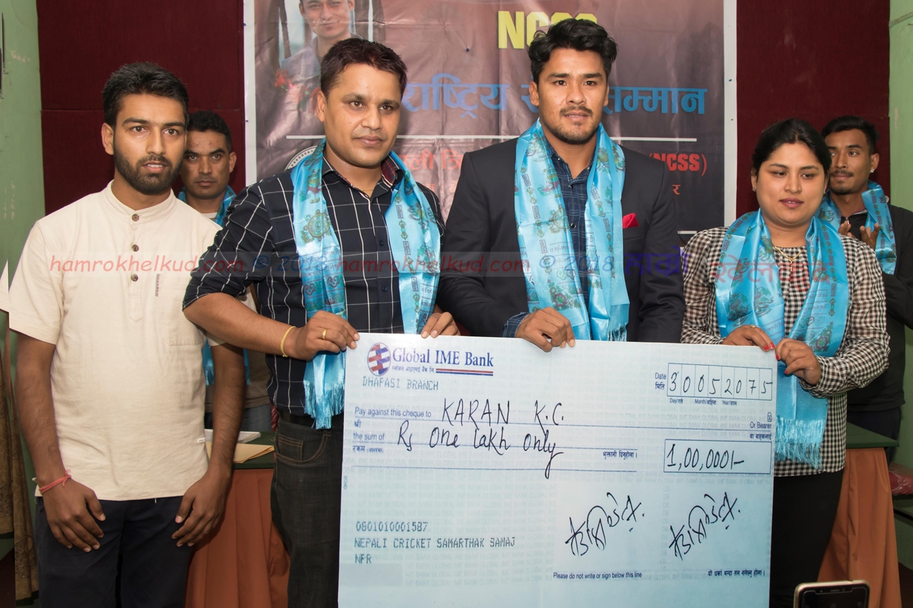 काठमाडौं (हाम्रो खेलकुद) – नेपाली राष्ट्रिय क्रिकेट टिममा महत्वपूर्ण सदस्य करण केसी र गन्डकी प्रदेशका युवा क्रिकेटर हरिबहादुर चौहानलाई नेपाली क्रिकेट समर्थक समाजले शनिबार सम्मान गरेको छ । नेपाल क्रिकेट समर्थक समाज (एनसिएसएस) ले आफ्ना स्वर्गीय सदस्य प्रमोद बज्राचार्यको स्मृतिमा करणलाई नगद १ लाखसहित विशेष सम्मान र हरि चौहानलाई २५ हजारसहित इमर्जिङ खेलाडीको रुपमा राष्ट्रिय सेवा सम्मानबाट सम्मानित […]