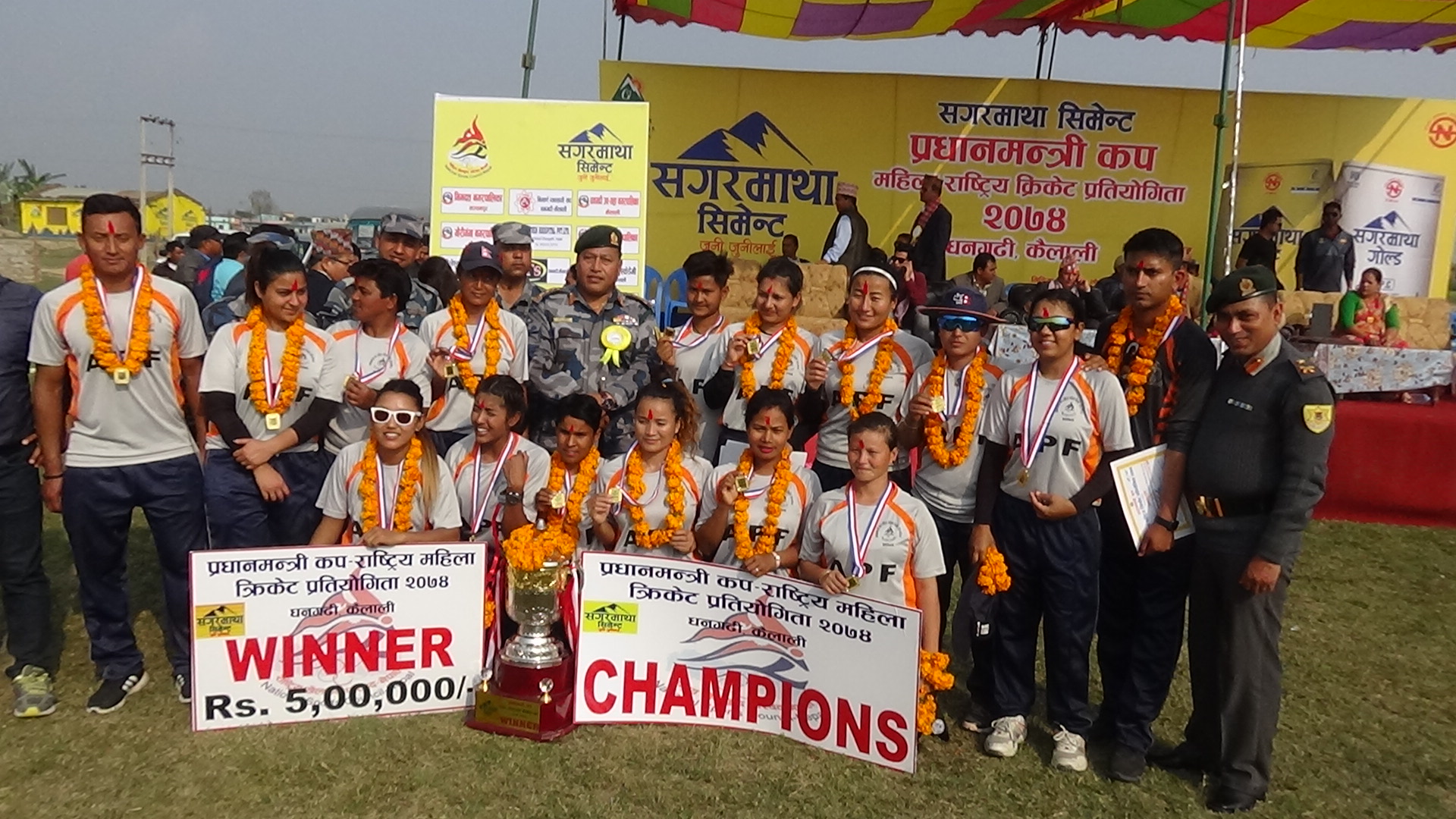 धनगढी (हाम्रो खेलकुद)– नेपाल एपिएफ क्लबले प्रधानमन्त्री कप महिला राष्ट्रिय क्रिकेट प्रतियोगिताको उपाधि जितेको छ । पूर्वाञ्चललाई आइतबार ७ विकेटले हराउँदै एपिएफ राष्ट्रिय महिला क्रिकेट प्रतियोगीताको च्याम्पियन बनेको हो । एपिएफले उपाधिसहित ५ लाख रुपैयाँ र पूर्वाञ्चलले २ लाख रुपैयाँ प्राप्त गर्यो । ६१ रनको झिनो लक्ष्यका साथ मैदान उत्रिएको एपिएफले १६.३ ओभरमा ३ विकेट […]