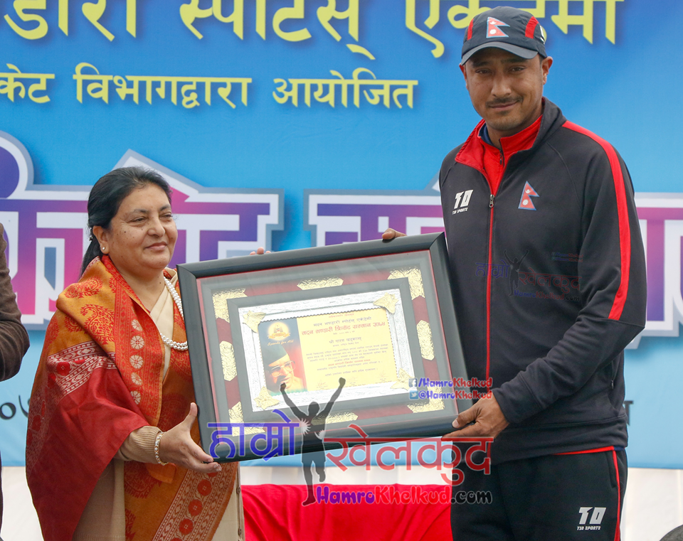 काठमाडौं (हाम्रो खेलकुद) — नेपाली राष्ट्रिय क्रिकेट टोलीका कप्तान पारस खड्का मदन भण्डारी क्रिकेट सम्मानबाट शुक्रबार सम्मानित भएका छन् । मदान भण्डारी स्पोर्टस एकेडेमीको क्रिकेट विभागले कीतिपुरस्थित त्रिभुवन विश्व विद्यालयको मैदानमा आयोजना गरेको प्रथम क्रिकेट महोत्सवका क्रममा पारसलाई सम्मान गरिएको हो । राष्ट्रपति विद्यादेवि भण्डारीले पारसलाई सम्मान पत्र प्रदान गरिन् । पारसले २५ हजार रुपैयाँ […]