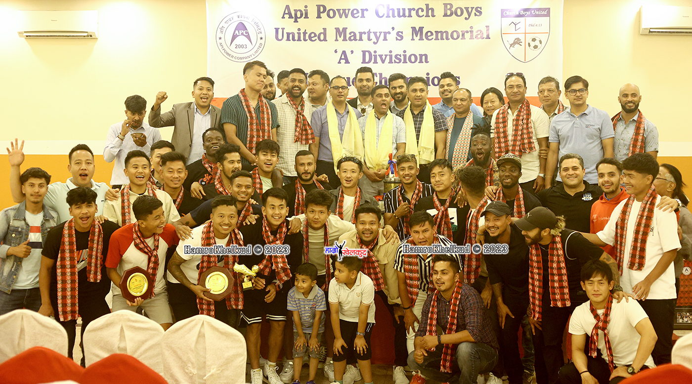 काठमाडौं (हाम्रो खेलकुद) – सहिद स्मारक ए डिभिजन लिग २०७९ को च्याम्पियन चर्च ब्वाइज युनाइटेडलाई अपि पावर कम्पनि लिमिटेडले सम्मान गरेको छ । क्लबको मुख्य प्रायोजक रहेको अपि पावरले लिगमा सहभागी सम्पूर्ण खेलाडी, प्रशिक्षक तथा अफिसियललाई सम्मान गरेको हो । काठमाडौंमा आयोजित रात्री भोजमा क्लबका खेलाडी, पदाधिकारी, प्रायोजक अपि पावरका प्रतिनिधिहरु सँगै क्लबका शुभचिन्तक उपस्थित […]