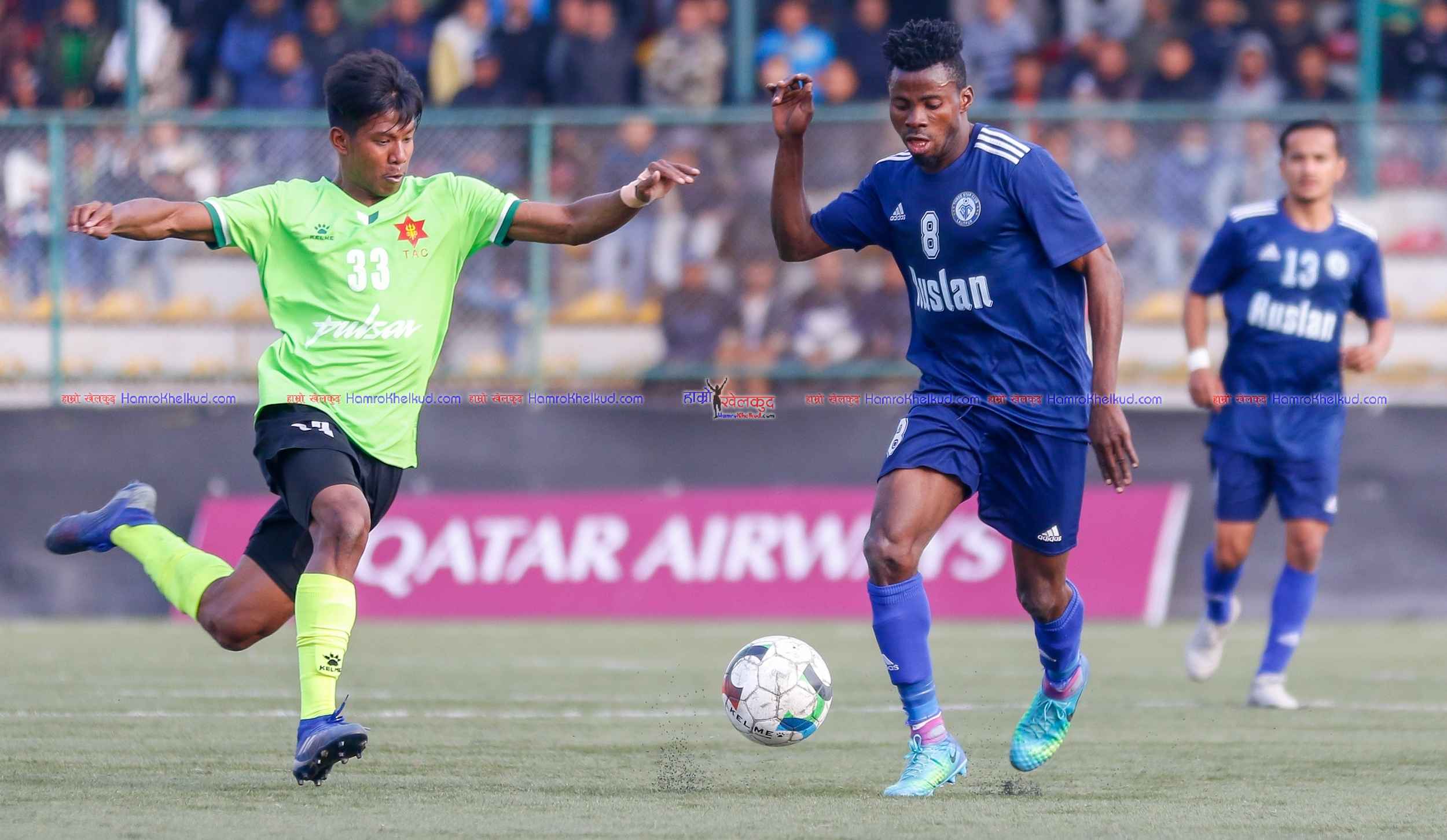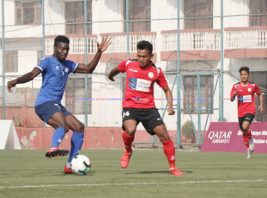 काठमाडौं (हाम्रो खेलकुद) – कतार एयरवेज सहिद स्मारक ए डिभिजन लिग अन्तर्गत बुधबार जारी खेलमा रुस्लान थ्री स्टार र त्रिभुवन आर्मी क्लबले पहिलो हाफमा गोलरहित बराबरी खेलेका छन् । खेलकाे पहिलाे मिनेटमा नै आर्मीका नवयुग श्रेष्ठकाे पासमा कप्तान भरत खवासकाे प्रहार गाेलरक्षक प्रिसाेले सहजै बचाउ गरे । १२ औं मिनेटमा थ्री स्टारका हम्जातकाे प्रहार डिफेन्डरले […]