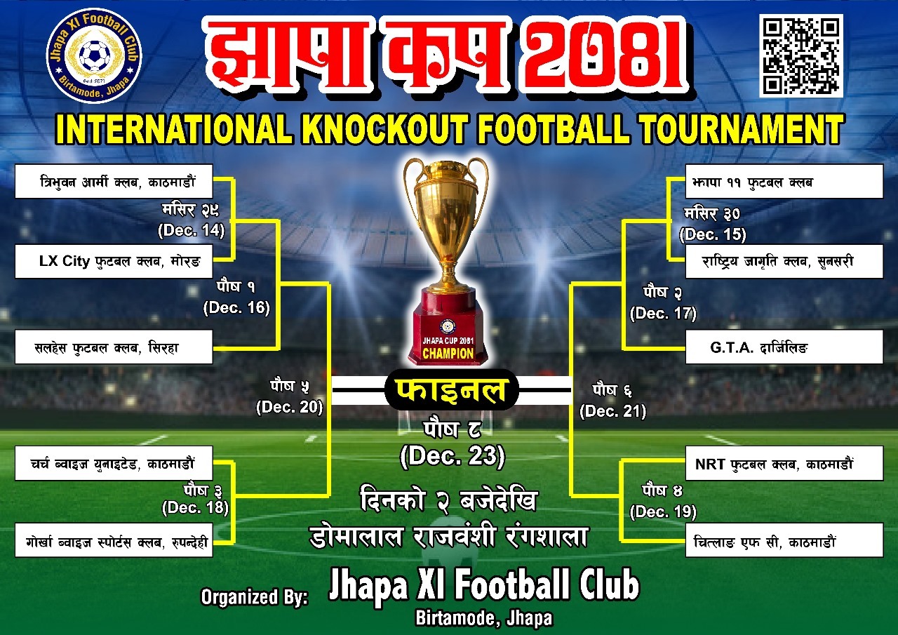 हिमाल खरेल,बिर्तामोड झापा कपको उद्घाटन खेल आज त्रिभुवन आर्मी फुटबल क्लब र मोरङको एलएक्स सिटी फुटबल क्लबबीच प्रतिस्पर्धा हुनेछ । झापा ११ फुटबल क्लबको आयोजनामा हुन लागेको प्रतियोगितामा सिराहाको सलहेस युवा क्लब, एनआरटी फुटबल क्लब, चर्च ब्वाइज युनाइटेड, इटहरीको राष्ट्रिय जागृति क्लब सहभागी छनम । त्यस्तै, दार्जिलिङको जिटिए, काठमाडौं जिल्ला लिग च्याम्पियन चित्लाङ फुटबल क्लब, […]