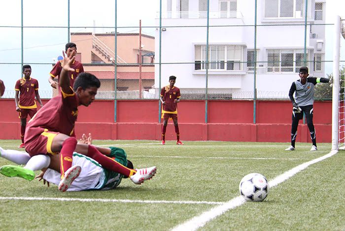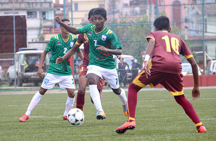 काठमाडौँ (हाम्रो खेलकुद) – सातदोबाटो स्थित एन्फा टेक्निकल सेन्टरको कृतिम खेल मैदानमा आजबाट सुरु भएको साफ यू-१५ च्याम्पियनसिपको पहिलो खेलमा बंगलादेशले श्रीलंकालाई ४-० ले पराजित गरेको छ । समुह ‘ए’ को खेलको सुरुवात देखि हावी भएको बंगलादेका लागि मिडफिल्डर मोहम्मद फोयसल अहमद फहिमले ह्याट्रिक गरे । तस्बिर : बिबेक सुवेदी / हाम्रो खेलकुद