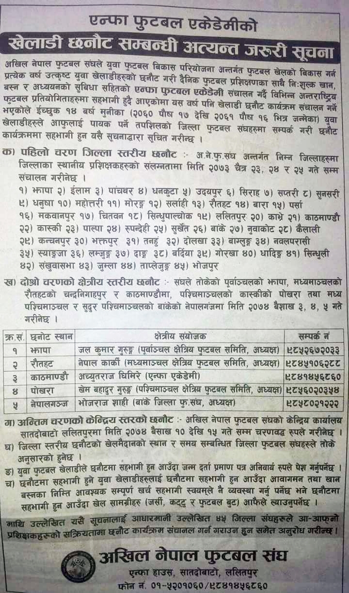 काठमाडौँ (हाम्रो खेलकुद) – अखिल नेपाल फुटबल संघले एन्फा एकेडेमीको लागि १४ वर्ष मुनिका खेलाडीहरुको खुला आवेदन मागेको छ। विज्ञापन जारी गर्दै एन्फाले सोको माग गरेको हो। हाल राष्ट्रिय टोलीमा रहेका अधिकांश खेलाडी एन्फा एकेडमीकै उत्पादन हुन्। विमल घर्ति मगर, अनन्त तामाङ र अन्जन विष्ट एकडेमीको एकै ब्याचका खेलाडी हुन्। एन्फाले वार्षिक रुपमा यस कार्यक्रम […]
