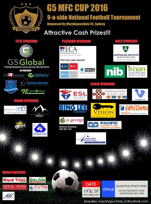 सिड्नी (हाम्रो खेलकुद)- अष्ट्रेलियाको सिड्नीमा यही आउदो नोवेम्बर १९ र २० तरिकमा जि फाईभ एमएफसि कप हुने भएको छ । प्रतियोगितामा फ्री उमेर समुहमा १६ टिमले र ३५भन्दा बढी उमेर समुहका ८ टिमहरुले सहभागिता जनाउने छन । प्रतियोगिताको आयोजना माछापुच्रे एफसिले गर्न लागेको हो । नाईन अ साईड पद्दतिको प्रतियोगिताको धन राशी फ्री उमेर अन्तर्गत […]