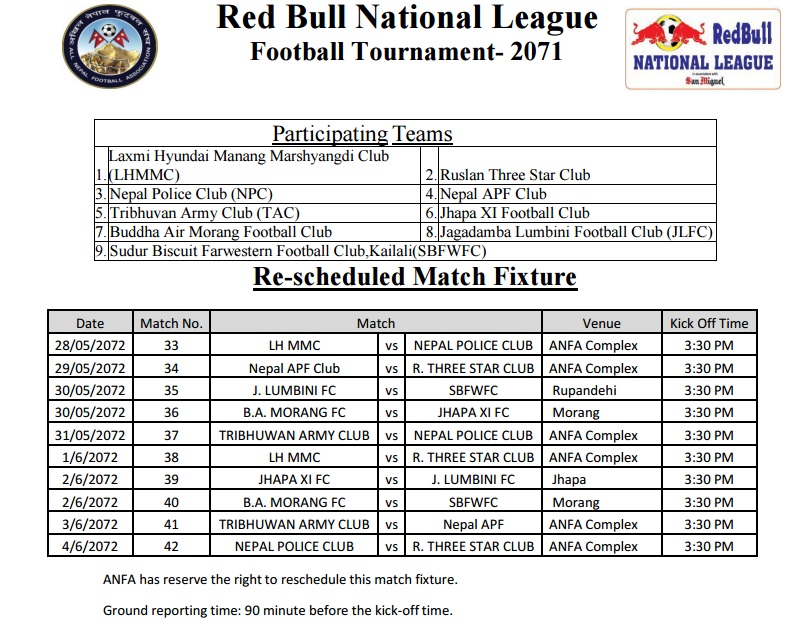 काठमाडौँ प्रथम ललित स्मृति यु १८ फुटबल प्रतियोगिताको उपाधि त्रिभुवन आर्मी क्लबले जितेको छ । जगदम्बा लुम्बिनी फुटबल क्लबलाई बुधबार ट्राइबेकरमा ३–१ ले हराउँदै आर्मीले उपाधि जितेको हो । त्यो जितसँगै समूह चरणमा लुम्बिनीसँगको हारको बदला लिन आर्मी सफल भएको थियो । त्यो बेला लुम्बिनीले आर्मीलाई ६–० ले हराएको थियो । सातदोबाटोस्थित एन्फा कम्प्लेक्सको एस्ट्रो […]
