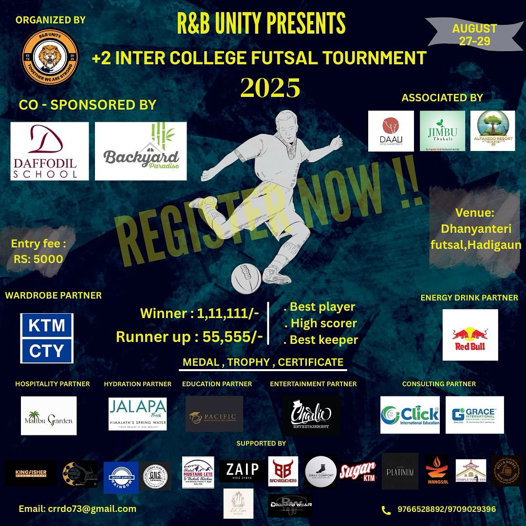 काठमाडौं (हाम्रो खेलकुद)- आर एण्ड बी युनिटीको आयोजनामा प्लस टु अन्तर कलेज फुटबल प्रतियोगिता हुनेछ। हाडिगाउँ स्थित धन्यन्तरी फुटसलमा भदौ ११ १२ गते प्रतियोगिता हुने भएको छ। आयोजकको अनुमान अनुसार प्रतियोगितामा ४० देखि ५० टोलीको सहभागिता रहनेछ। प्रतियोगिता नकआउट आधारमा सञ्चालन हुनेछ।दुई दिन सन्चालन हुने प्रतियोगिताको विजेताले १ लाख ११ हजार १ सय ११ र […]