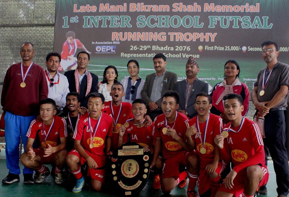 काठमाडौं (हाम्रो खेलकुद) – लिटिल एन्जल्स स्कुल (एलए) स्कुलले मणि बिक्रम शाह स्मृति अन्तर बिद्यालय फुटसल प्रतियोगिताको उपाधि जितेको छ । आइतवार भएको फाइनलमा एलएले माउण्ट ग्लोरी स्कुललाई ४–२ गोल अन्तरले हराँउदै पहिलो सस्करणको च्याम्पियन ट्रफि उचालेको हो । एलएको जितमा सिद्धान्त ठाकुरले २ गोल गर्दा मुनाल थापा र विकास पुनले समान एक गोल गे […]