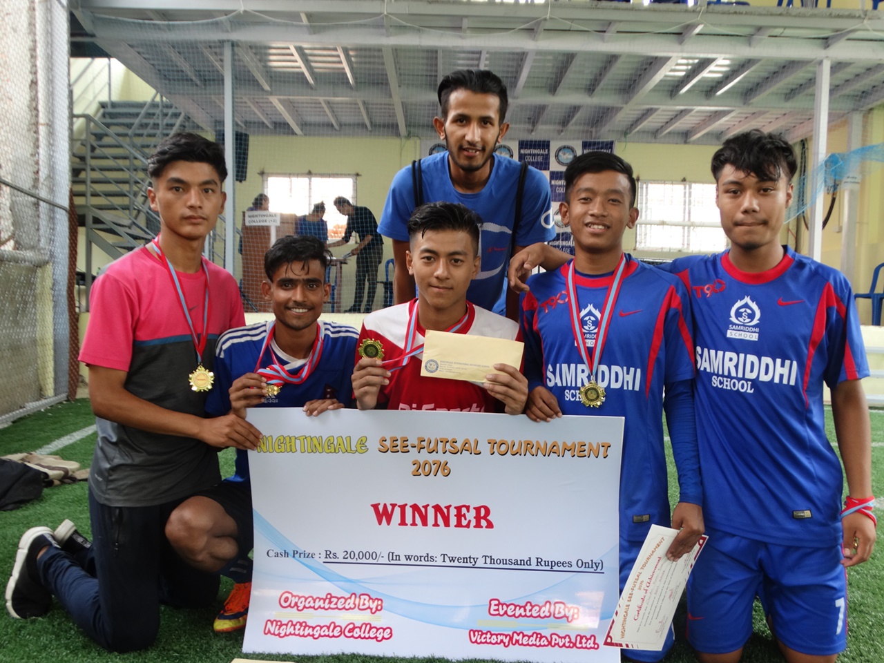 काठमाडौं (हाम्रो खेलकुद) – समृद्धि कलेजले एसईई फुटसल कपको उपाधि जितेको छ । कुपण्डोल सानेपास्थित नाइटिङ्गेल कलेजको फुटसल मैदानमा शुक्रबार भएको निकै न प्रतिस्पर्धात्मक खेलमा समृद्धिले आयोजक नाइटिङ्गेल कलेजलाई पेनाल्टी सुटआउटमा पराजित गर्दै उपाधि हात पारेको हो । निर्धारित समयको खेल १–१ गोलको बराबरीमा सकिएको थियो । उपाधिसँगै समृद्धिले २० हजार रुपैयाँ पायो । विधागततर्फ […]